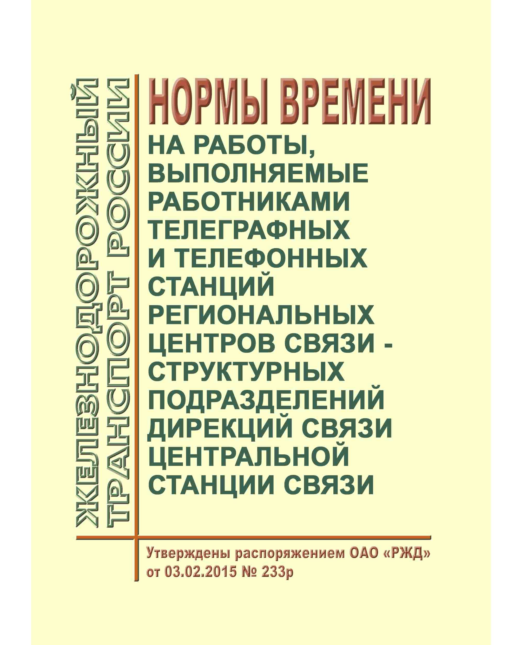 Нормы времени на работы, выполняемые работниками телеграфных и телефонных станций региональных центров связи - структурных подразделений дирекций связи Центральной станции связи. Утверждены Распоряжением ОАО "РЖД" от 03.02.2015 № 233р