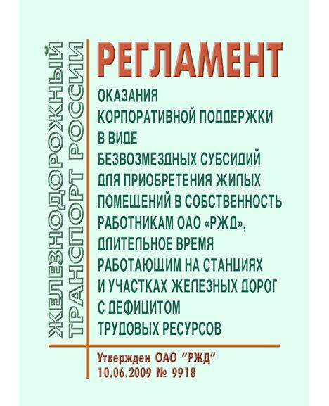 Регламент оказания корпоративной поддержки в виде безвозмездных субсидий для приобретения жилых помещений в собственность работникам ОАО "РЖД", длительное время работающим на станциях и участках железных дорог с дефицитом трудовых ресурсов. Утвержден ОАО "РЖД" 10.06.2009 № 9918 в редакции Распоряжения ОАО "РЖД" от 17.04.2014 № 937р