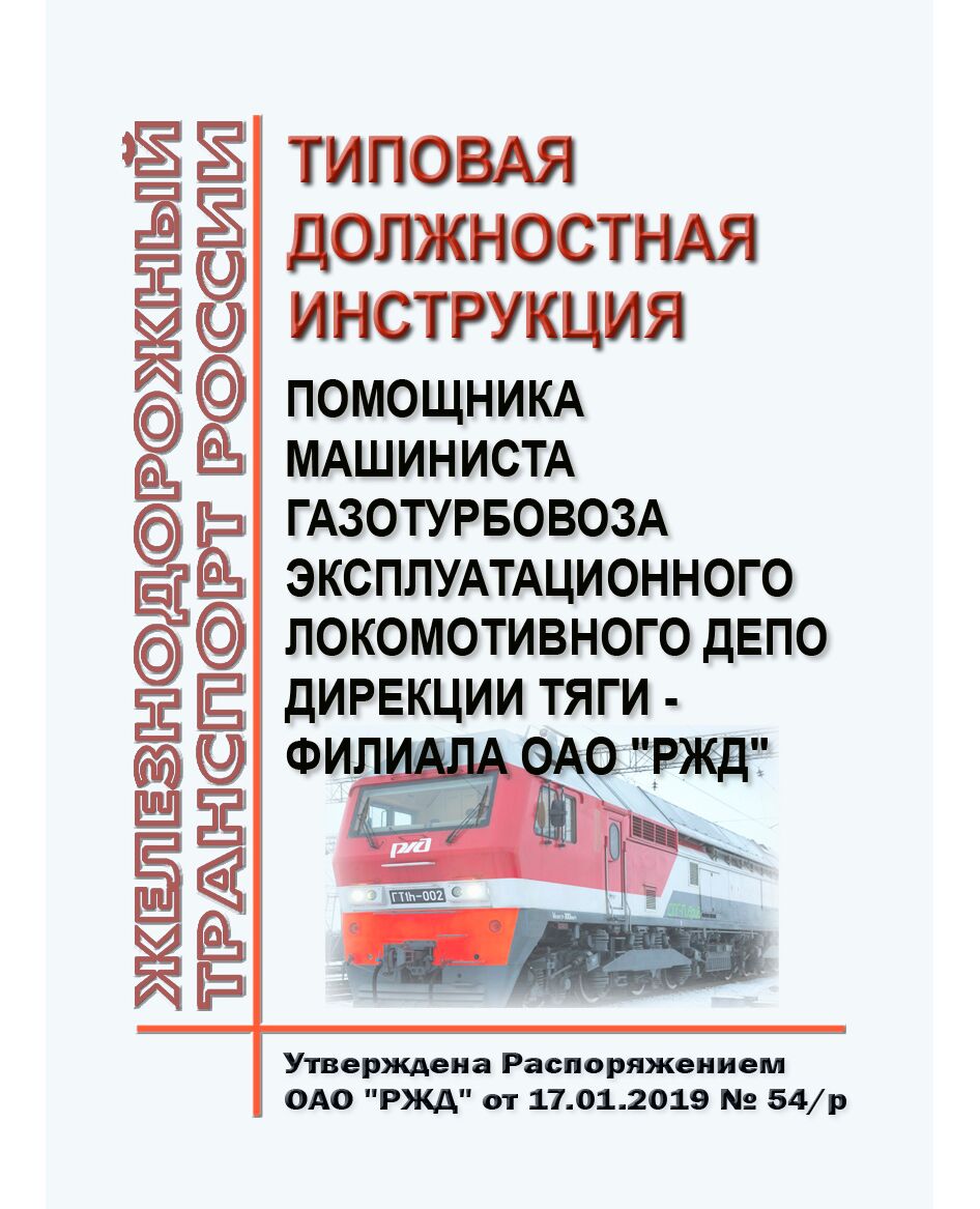 Типовая должностная инструкция помощника машиниста газотурбовоза эксплуатационного локомотивного депо Дирекции тяги - филиала ОАО "РЖД". Утверждена Распоряжением ОАО "РЖД" от 17.01.2019 № 54/р