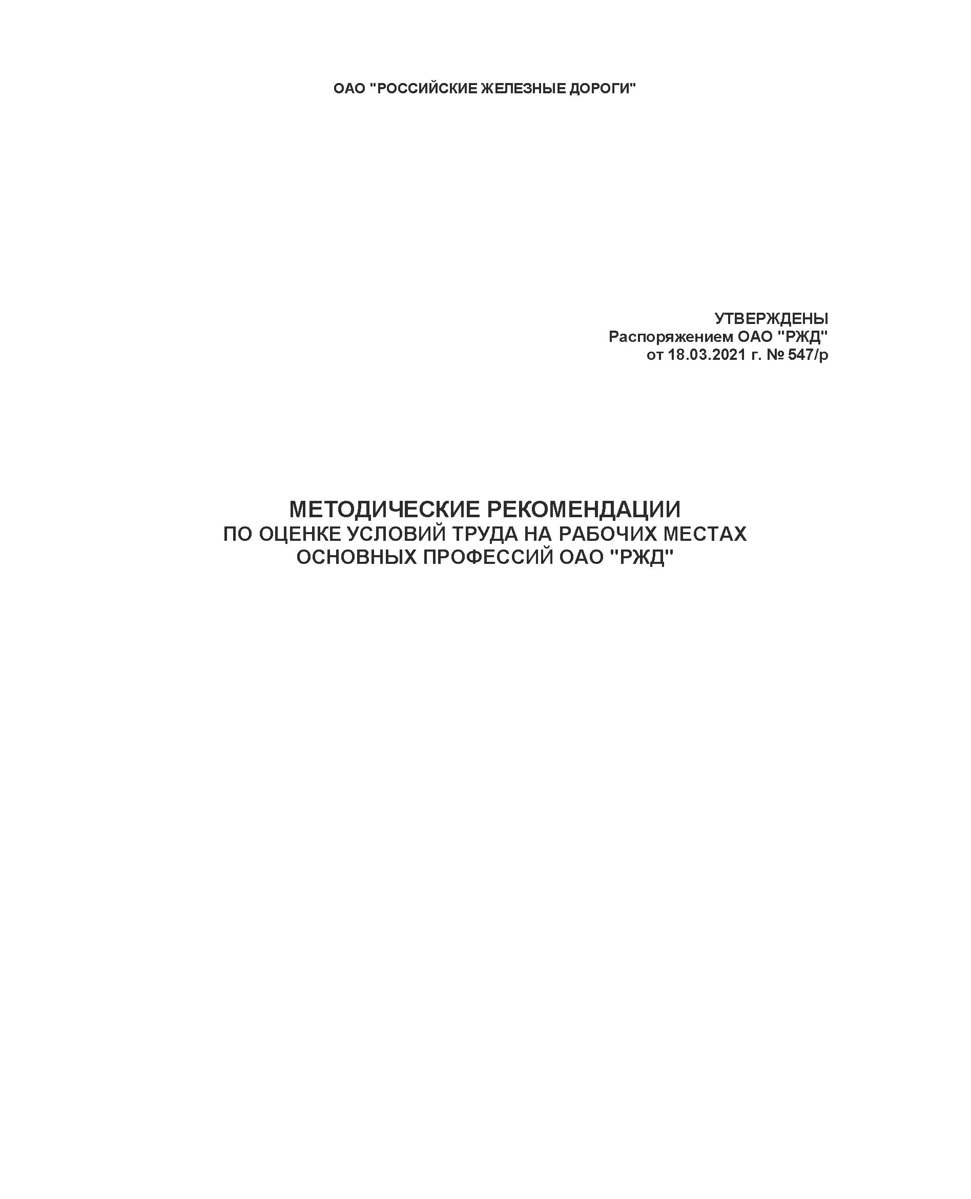 Взамен Методических рекомендаций по оценке условий труда для основных профессий ОАО "РЖД", утв. Распоряжением ОАО "РЖД" от 19.12.2012 № 2614р