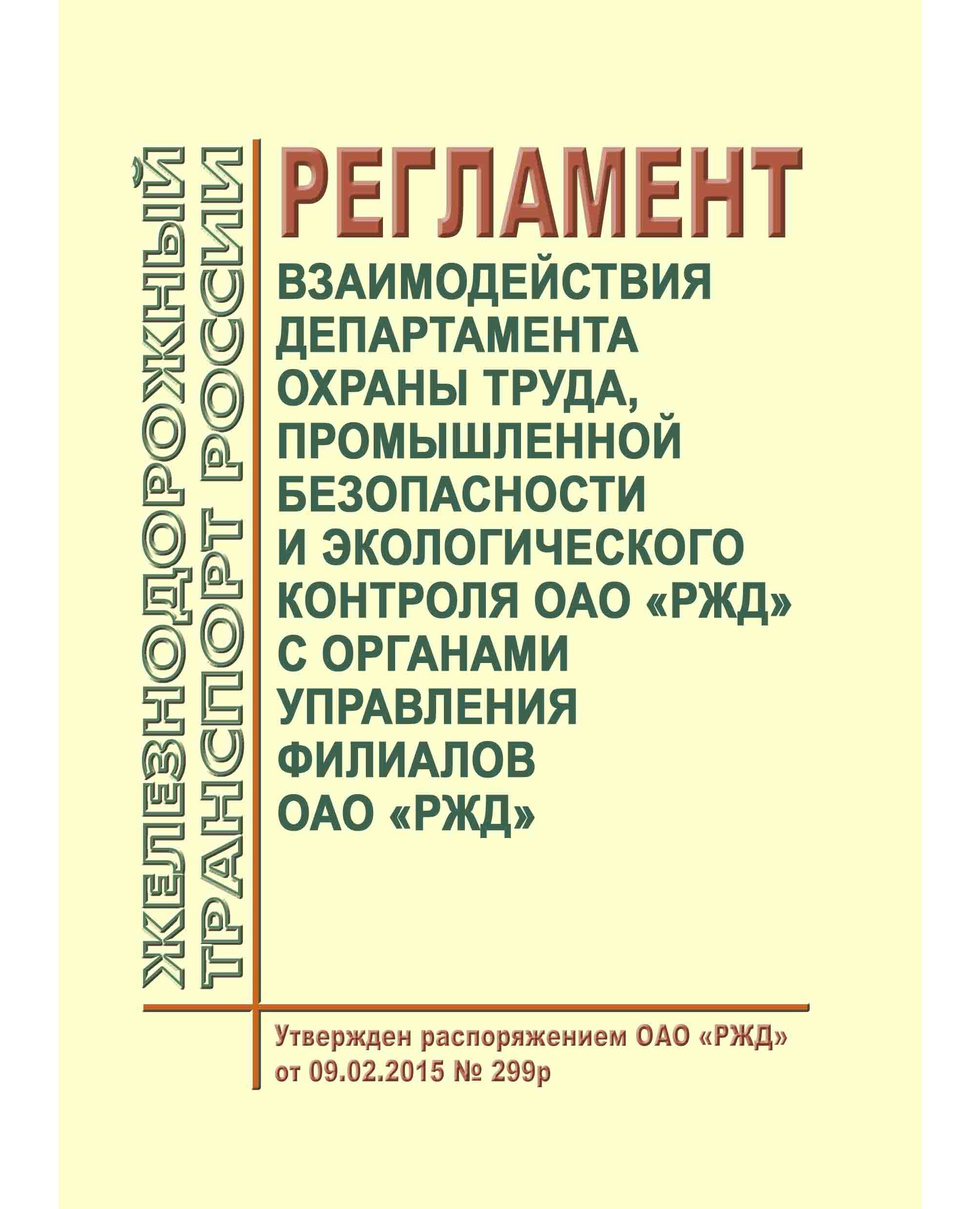 Регламент взаимодействия Департамента охраны труда, промышленной безопасности и экологического контроля ОАО "РЖД" с органами управления филиалов ОАО "РЖД" разработан в целях установления порядка взаимодействия Департамента охраны труда, промышленной безопасности и экологического контроля ОАО "РЖД" - подразделения аппарата управления ОАО "РЖД" (далее по тексту именуется "Департамент") с филиалами ОАО "РЖД", в лице уполномоченных органов управления, по вопросам: