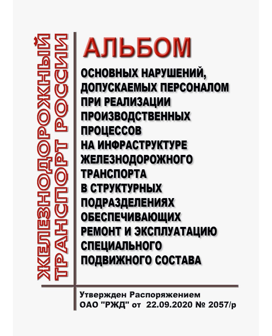 Главная/Книжные издания (Книги, брошюры)/Железнодорожный транспорт/Подвижной состав, (ЦДМВ)/Альбом основных нарушений, допускаемых персоналом при реализации производственных процессов на инфраструктуре железнодорожного транспорта в структурных подразделениях обеспечивающих ремонт и эксплуатацию специального подвижного состава. Утвержден Распоряжением ОАО "РЖД" от 22.09.2020 № 2057/р
