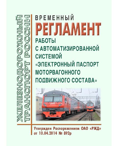 Настоящий регламент определяет порядок работы с автоматизированной системой "Электронный паспорт моторвагонного подвижного состава" (АС ЭП МВПС) в ходе проведения технического обслуживания, неплановых, текущих и заводских видов ремонта моторвагонного подвижного состава (МВПС), а так же их сервисного обслуживания и выпуска нового оборудования и МВПС.