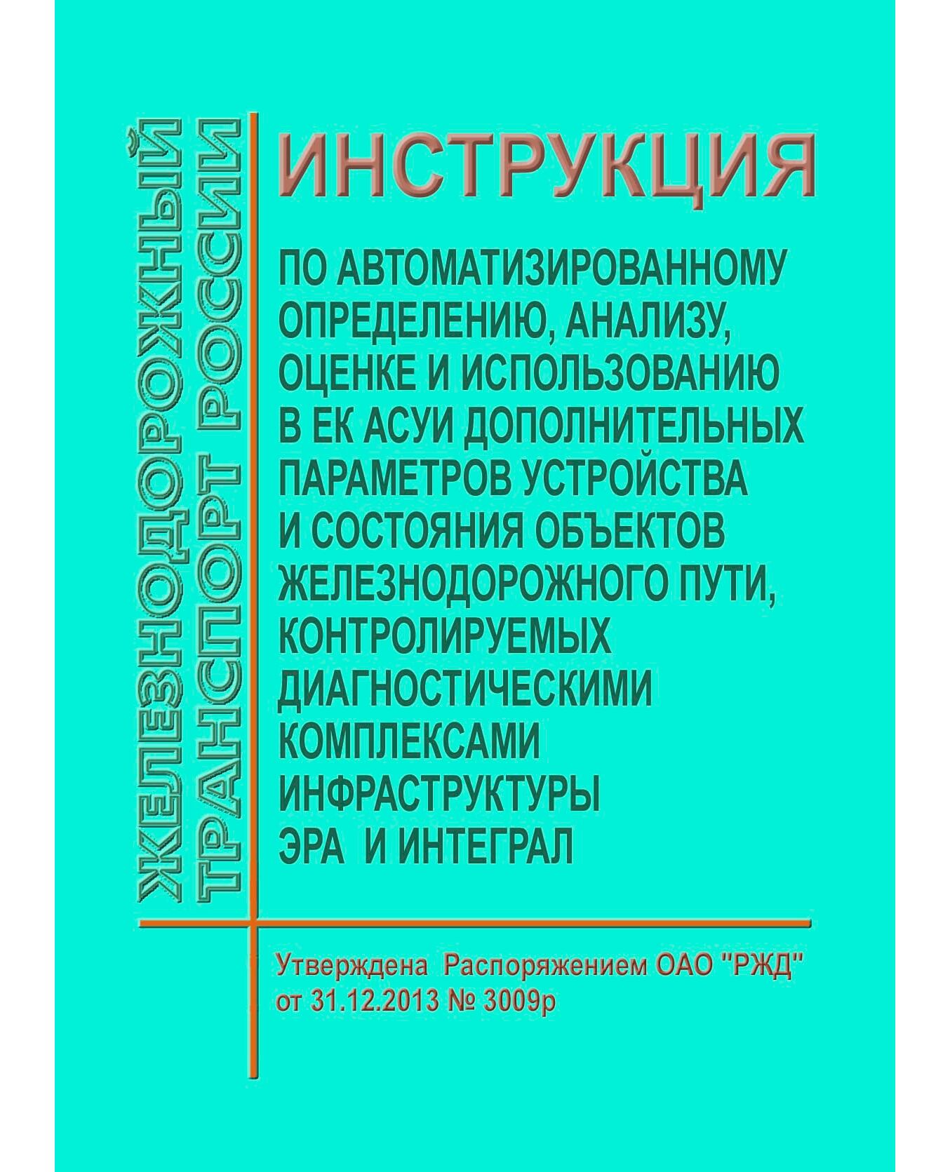 Инструкция определяет порядок автоматизированного определения, анализа и оценки дополнительных параметров устройства и состояния объектов железнодорожного пути, контролируемых ДКИ и порядок использования полученной информации для мониторинга фактического состояния объектов железнодорожного пути в Единой корпоративной Автоматизированной системе управления инфраструктурой (ЕК АСУИ).