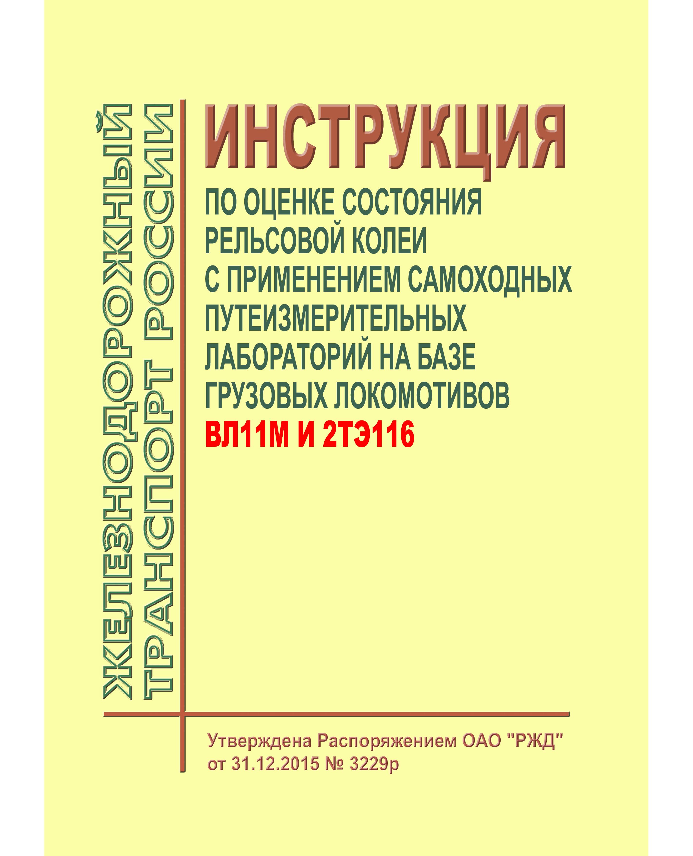 Настоящая Инструкция регламентирует порядок контроля, автоматизированной оценки и регистрации параметров динамической рельсовой колеи, использования информации, получаемой при проверке линий грузового движения поездов (тяжеловесных, с повышенными осевыми нагрузками, массой и длиной поезда) самоходными путеизмерительными лабораториями (СПЛг) на базе грузовых локомотивов с нагрузками на ось более 22 т (ВЛ-11м, 2ТЭ116 и др.).