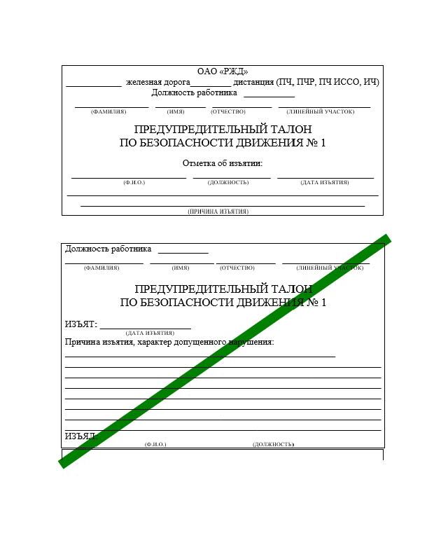 Предупредительный талон по безопасности движения № 1. Приложение № 3 к Положению о формуляре по безопасности движения поездов работников путевого хозяйства Центральной дирекций инфраструктуры, утв. Распоряжением ОАО "РЖД" от 08.10.2020 № 2233/р