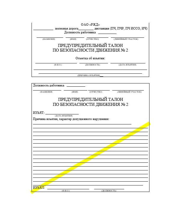 Предупредительный талон по безопасности движения № 2. Приложение № 3 к Положению о формуляре по безопасности движения поездов работников путевого хозяйства Центральной дирекций инфраструктуры, утв. Распоряжением ОАО "РЖД" от 08.10.2020 № 2233/р