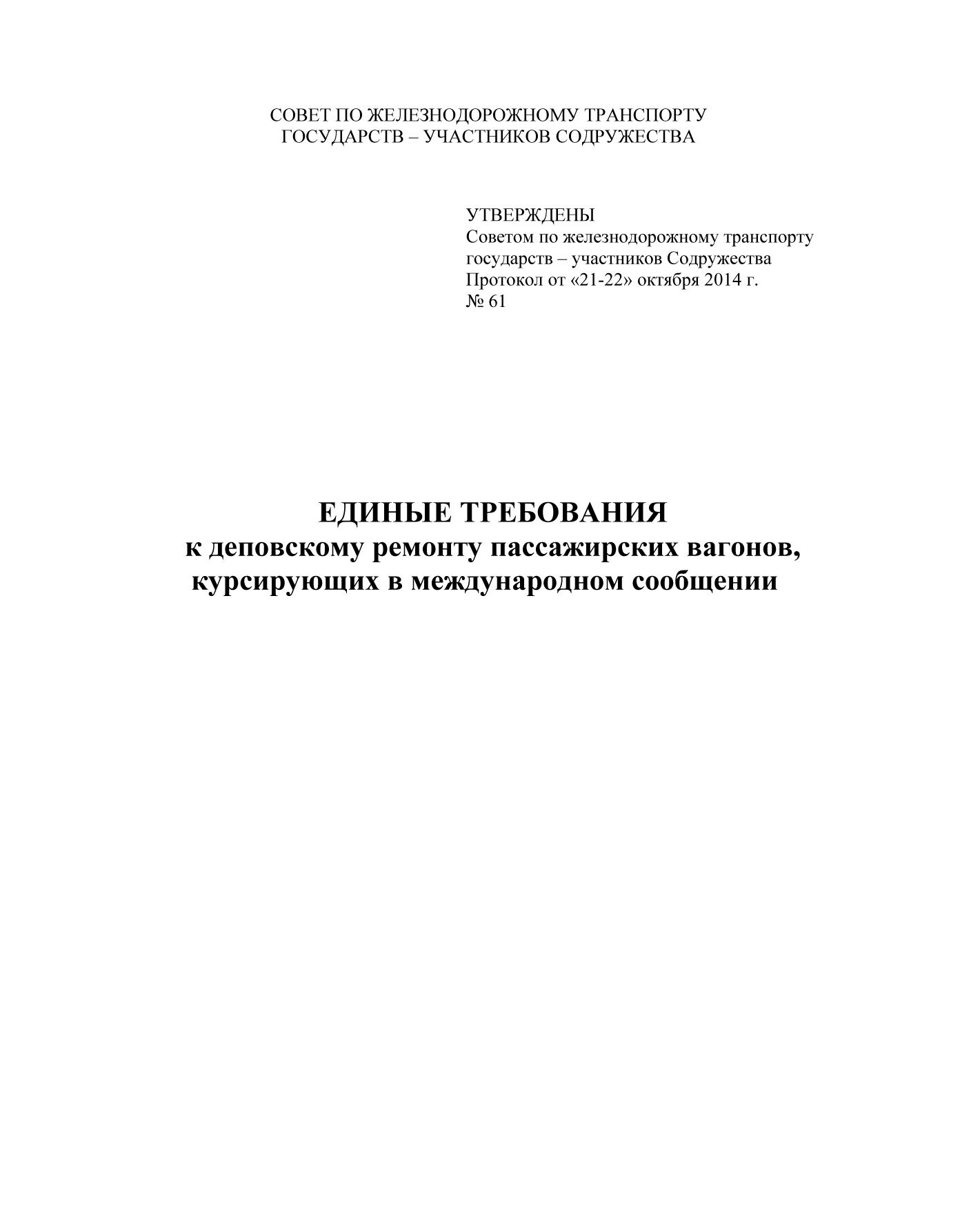 Настоящий документ устанавливает единые требования к проведению деповского ремонта (требования к ДР) пассажирских вагонов колеи 1520 мм, курсирующих в международном сообщении в соответствии с ПППВ. Проведение ремонта осуществляется на ремонтных предприятиях государств-участников Содружества Независимых Государств, Грузии, Латвийской Республики, Литовской Республики, Эстонской Республики, имеющих разрешение на данный вид деятельности в соответствии с национальным законодательством и с Положением об условных номерах клеймения.
