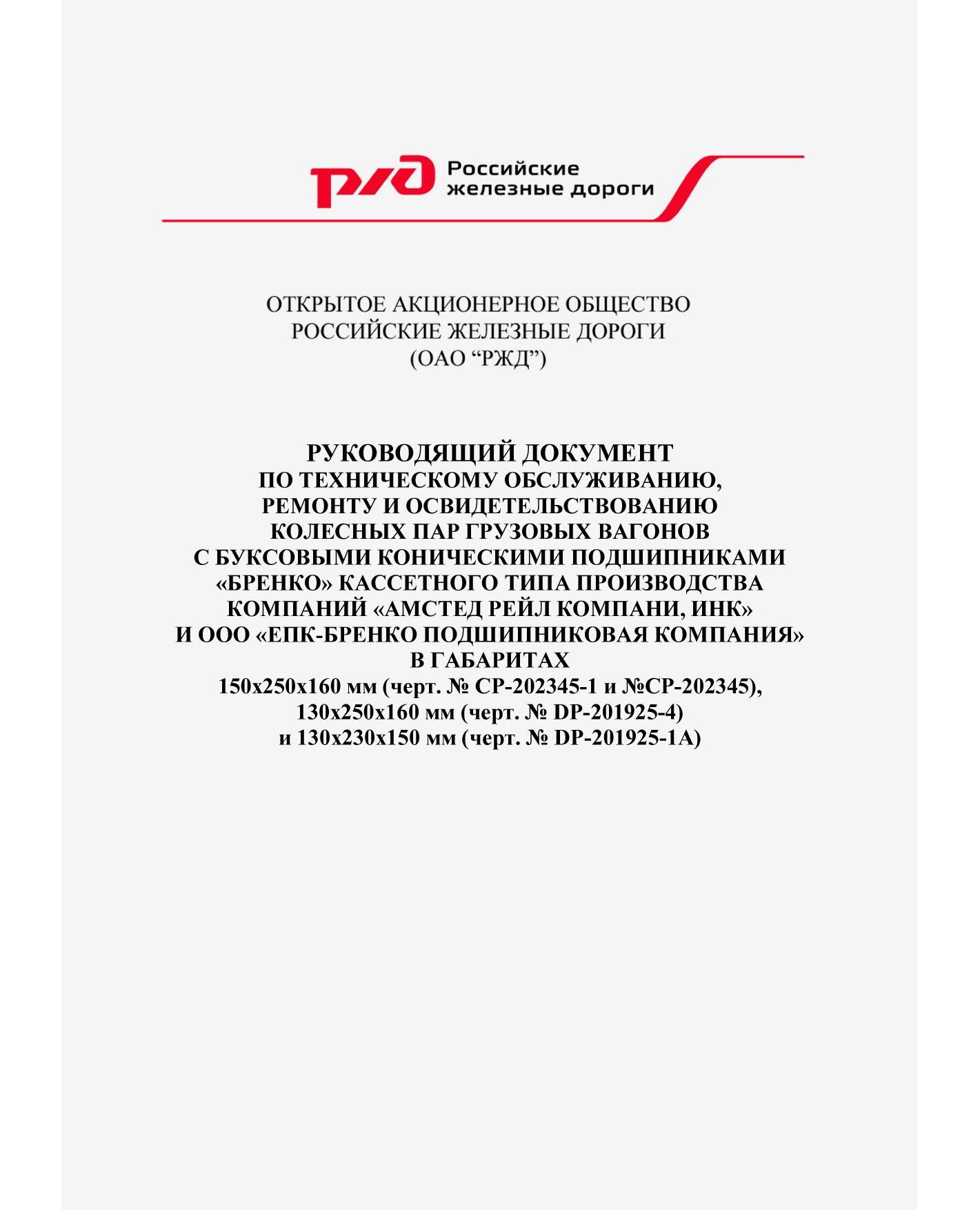 Настоящий Руководящий документ содержит материалы по конструкции, эксплуатации, техническому обслуживанию, ремонту и освидетельствованию колесных пар грузовых вагонов с буксовыми коническими подшипниками "БРЕНКО" кассетного типа производства компаний "Амстед Рейл Компани, Инк" и ООО "ЕПК-Бренко Подшипниковая Компания" в габаритах 150х250х160 мм (черт. № СР-202345-1 и № СР-202345), 130х250х160 мм (черт. № DP-201925-4) и 130х230х150 мм (черт. № DP-201925-1A) (далее по тексту подшипники).