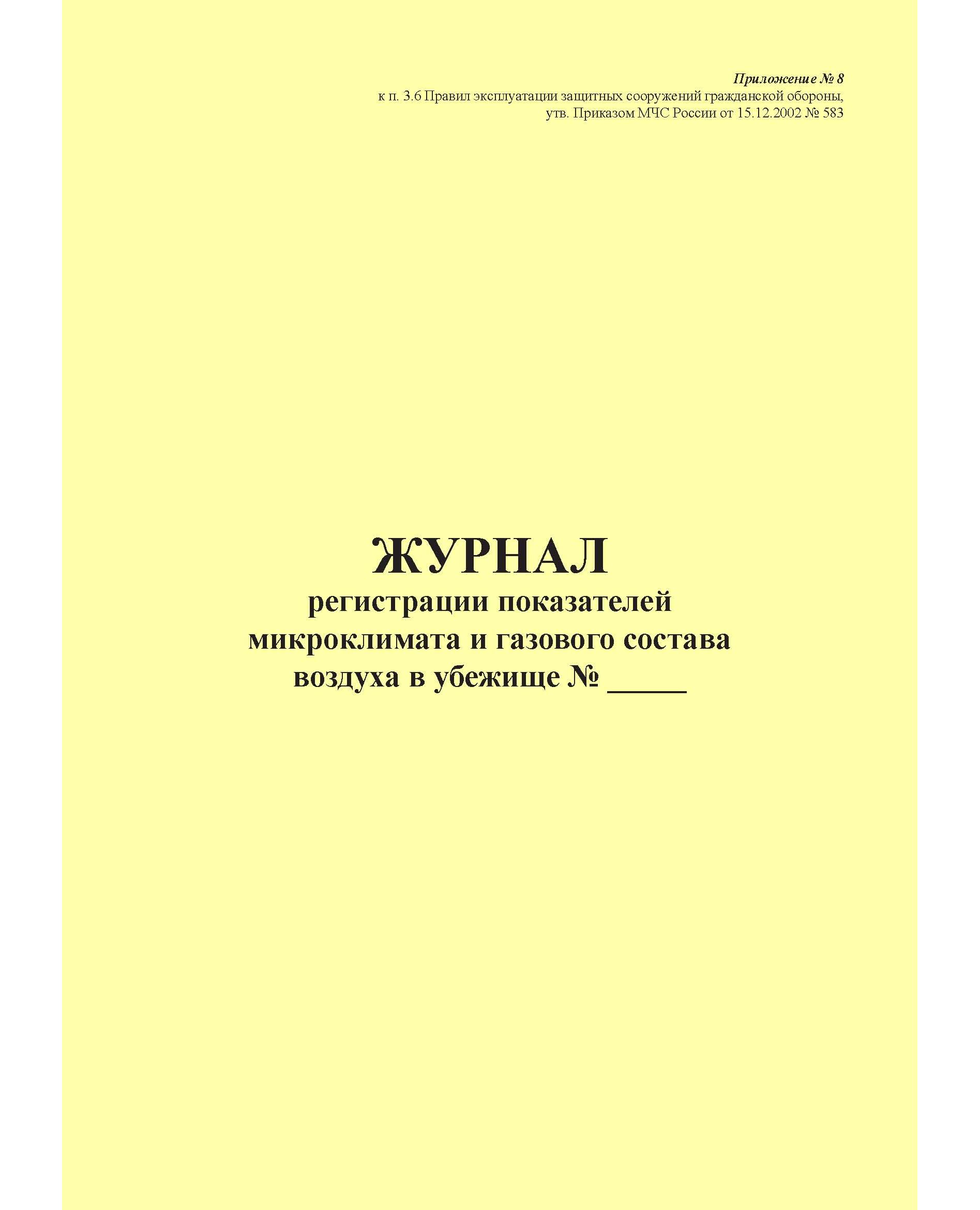 Журнал регистрации показателей микроклимата и газового состава воздуха в убежище. Приложение № 8 к п. 3.6 Правил эксплуатации защитных сооружений гражданской обороны, утв. Приказом МЧС России от 15.12.2002 № 583 (ред. от 26.06.2018), альбомный, прошитый, 100 стр.