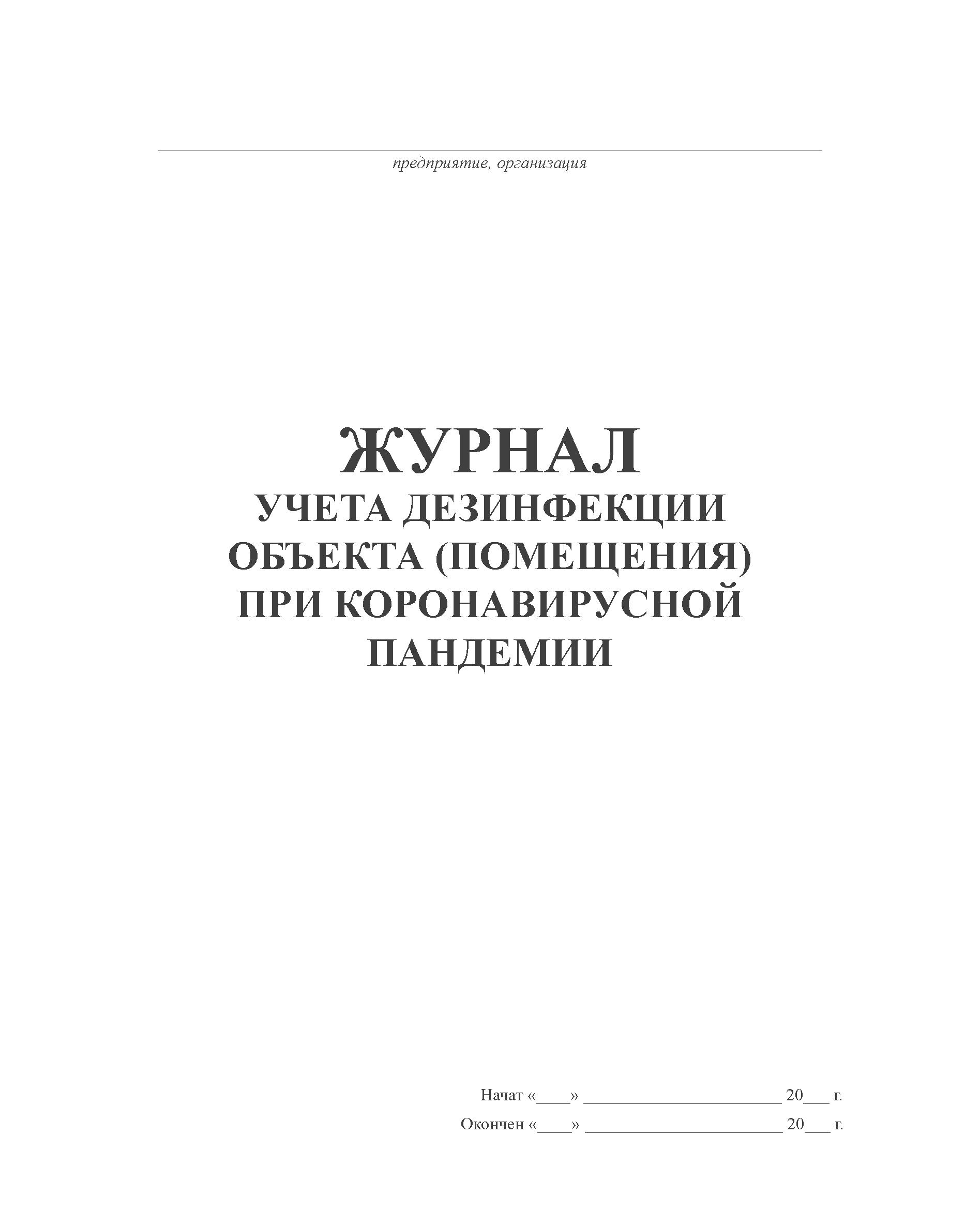 Журнал учета дезинфекции объекта (помещения) при коронавирусной пандемии. Форма в соответствии с Постановлением главного государственного санитарного врача по г. Москве от 22.02.2001 № 4 (книжный, прошитый, 100 стр.)