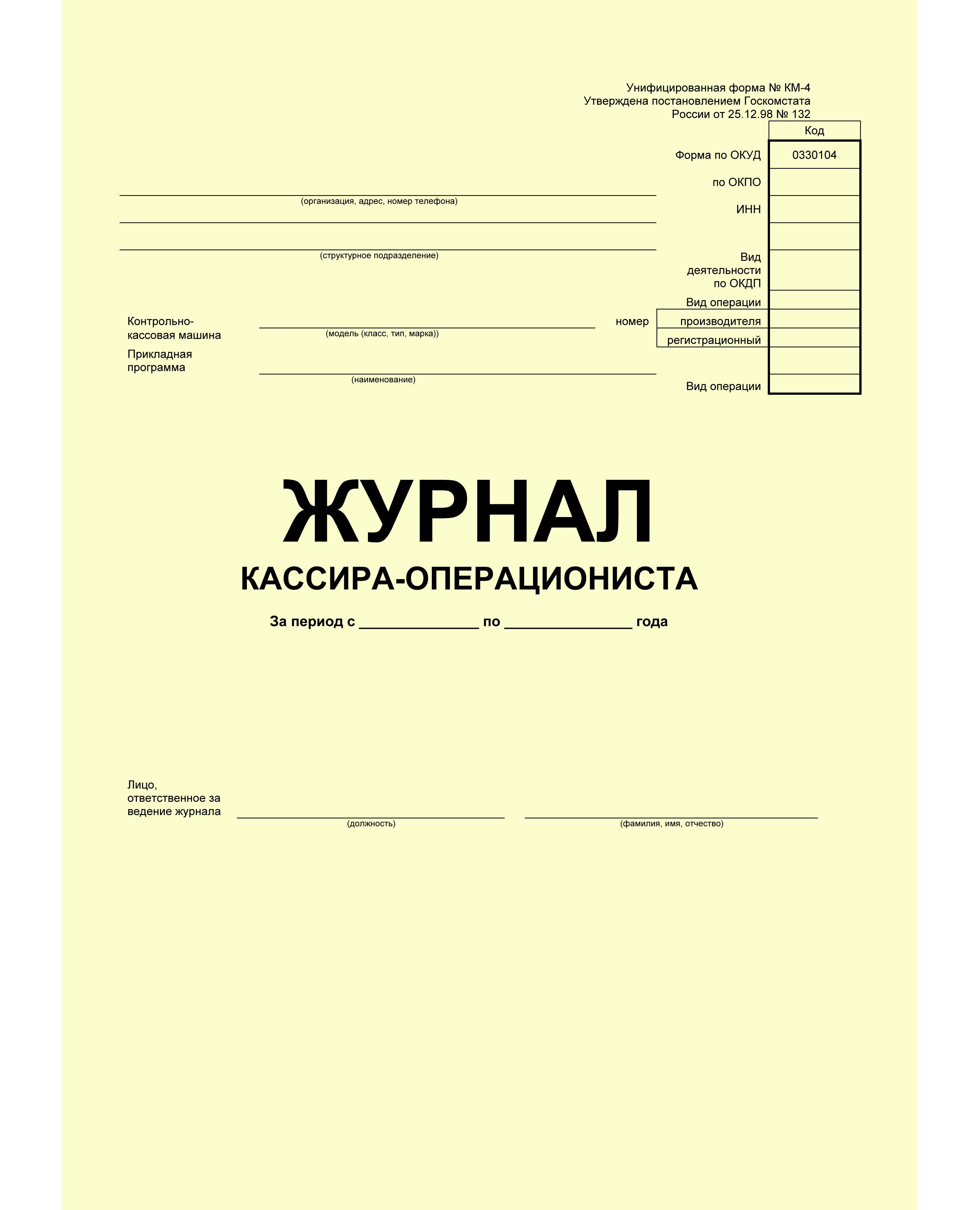 Журнал кассира-операциониста (форма № КМ-4) - применяется для учета операций по приходу и расходу наличных денег (выручки) по каждой контрольно-кассовой машине организации, а также является контрольно-регистрационным документом показаний счетчиков. Код формы по ОКУД 0330104.