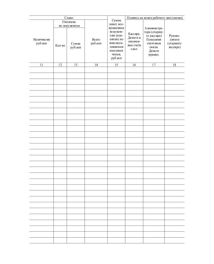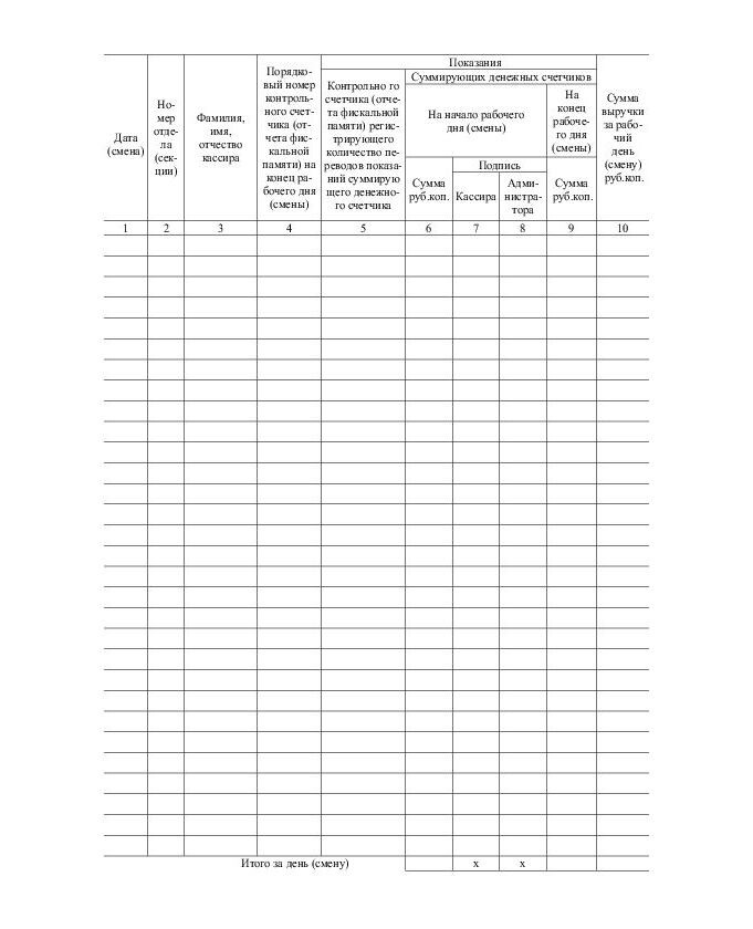 Графа 9: Показания суммирующих денежных счетчиков на конец рабочего дня (смены). В эту графу вписываются накопления (необнуляемый итог) в конце рабочей смены. Это те же накопления, что были в Графе 6, но к ним прибавлена выручка за прошедший день. Эти накопления списываются из Z-отчета, который кассир снимает в конце смены. Для удобства можно сразу же перенести эту сумму на начало следующей смены в графу 6.