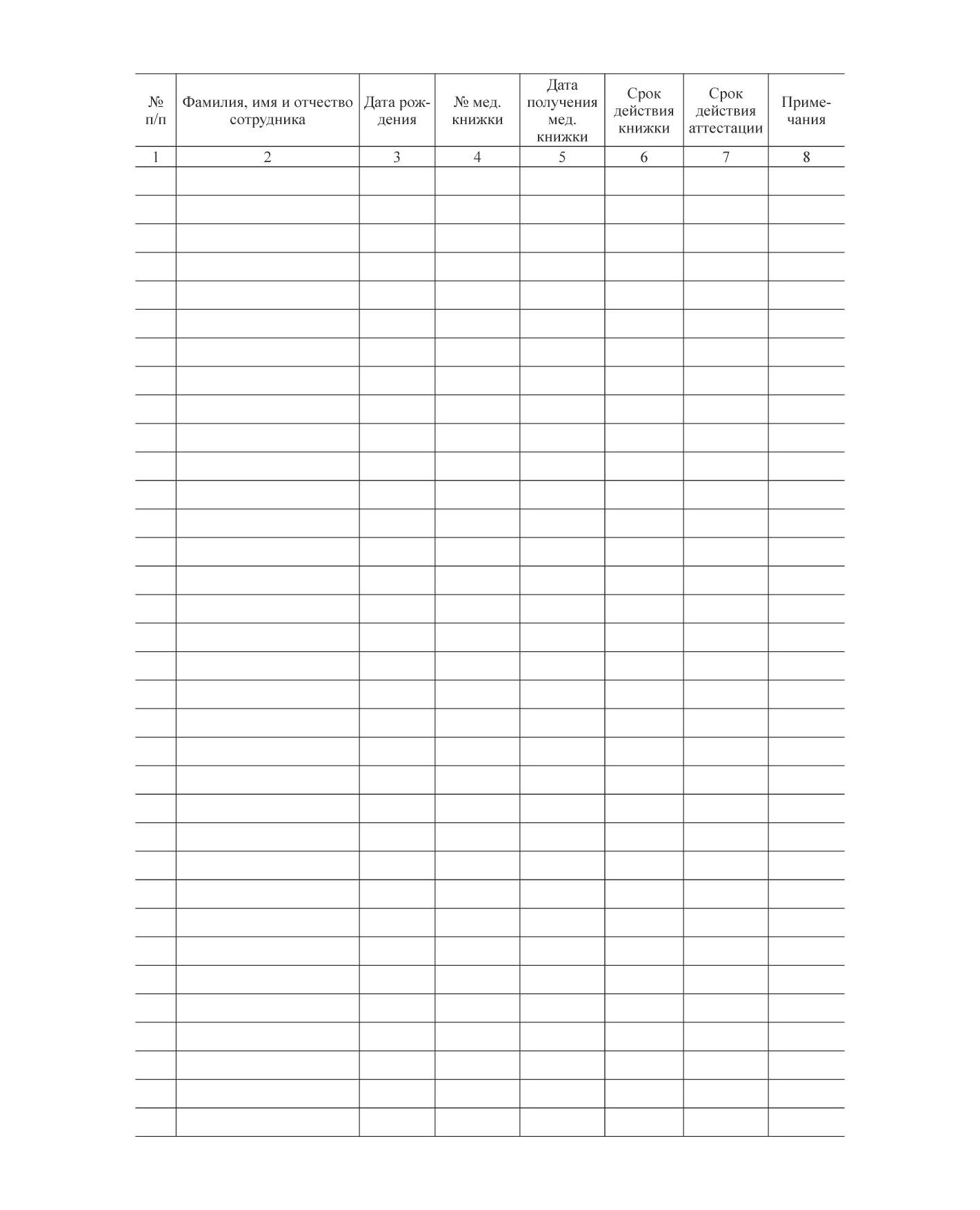 Журнал учета медицинских книжек работников - применяется для контроля за своевременным оформлением сотрудниками личных медицинских книжек, регулярным прохождением медицинских комиссий и гигиенических аттестаций.