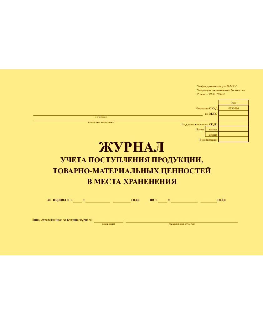 Журнал учета поступления продукции, товарно - материальных ценностей в места хранения по форме МХ-5 применяется для ведения количественного учета движения и остатков продукции, товарно - материальных ценностей материально ответственными лицами в местах хранения. Код по форме ОКУД 0335005.