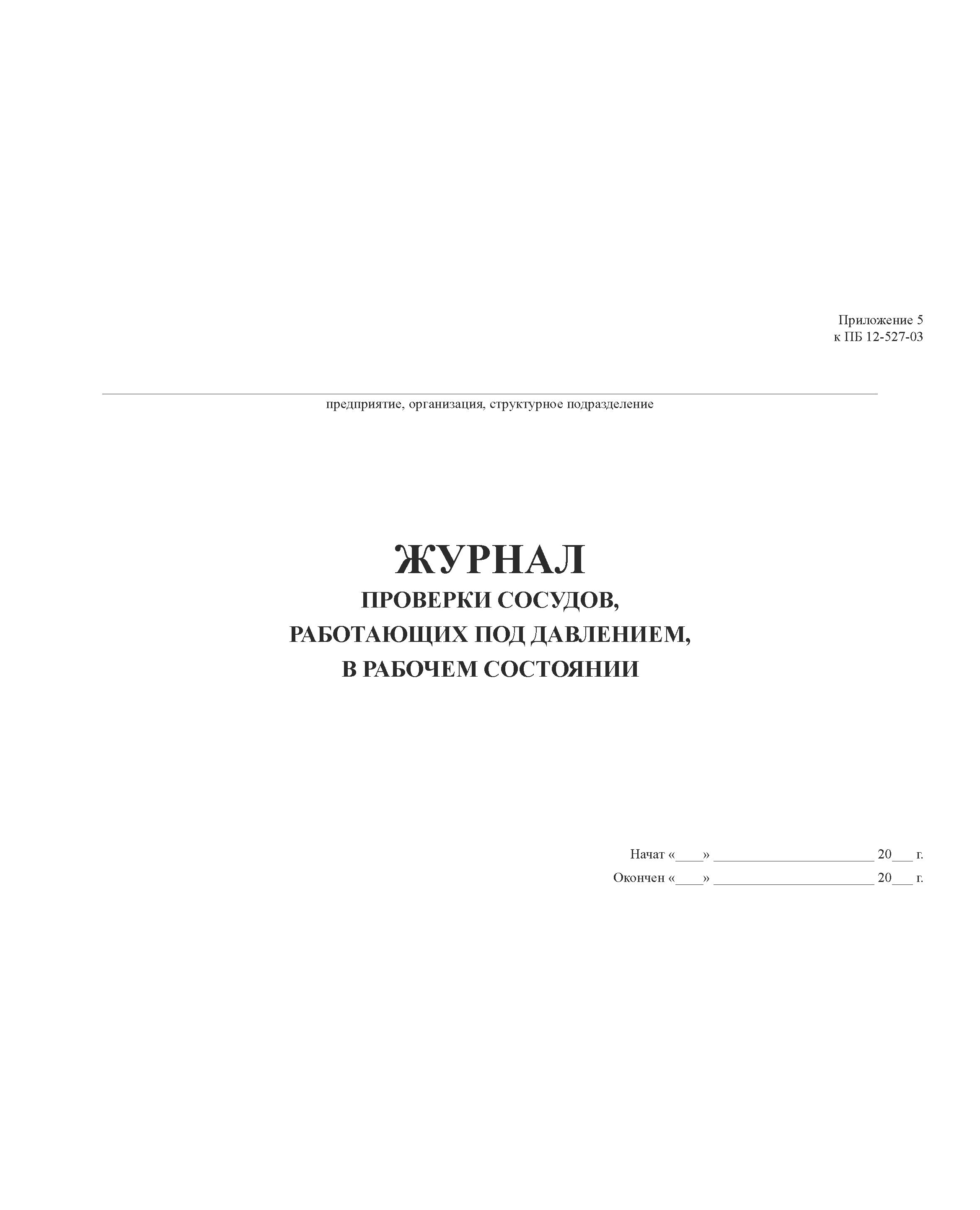 Журнал проверки сосудов, работающих под давлением, в рабочем состоянии. Приложение № 5 к ПБ 12-527-03 (прошитый, 100 стр.)