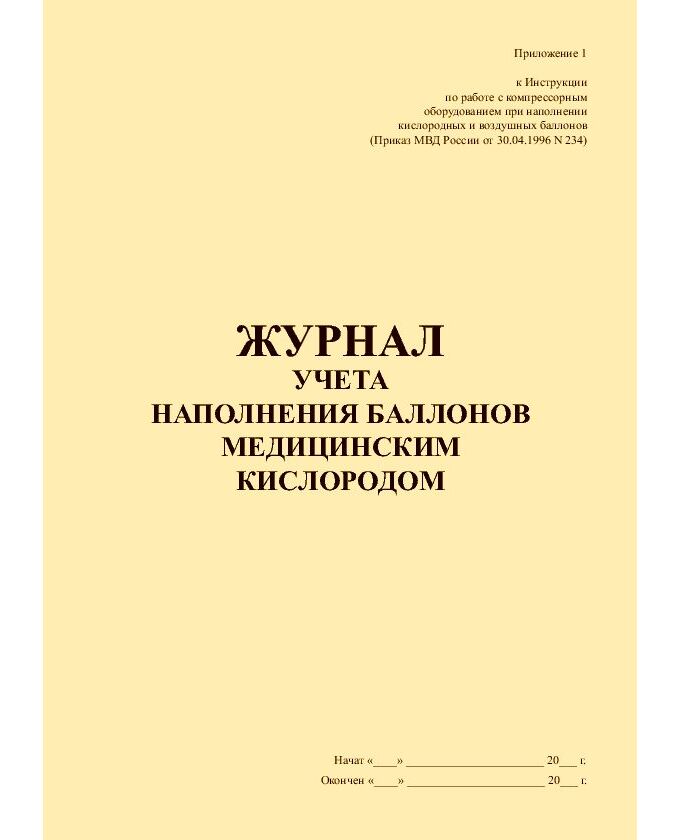 Журнал учета наполнения баллонов медицинским кислородом.. Приложение 1 к Инструкции по работе с компрессорным оборудованием при наполнении кислородных и воздушных баллонов (Приказ МВД России от 30.04.1996 N 234) (прошитый, 100 страниц)
