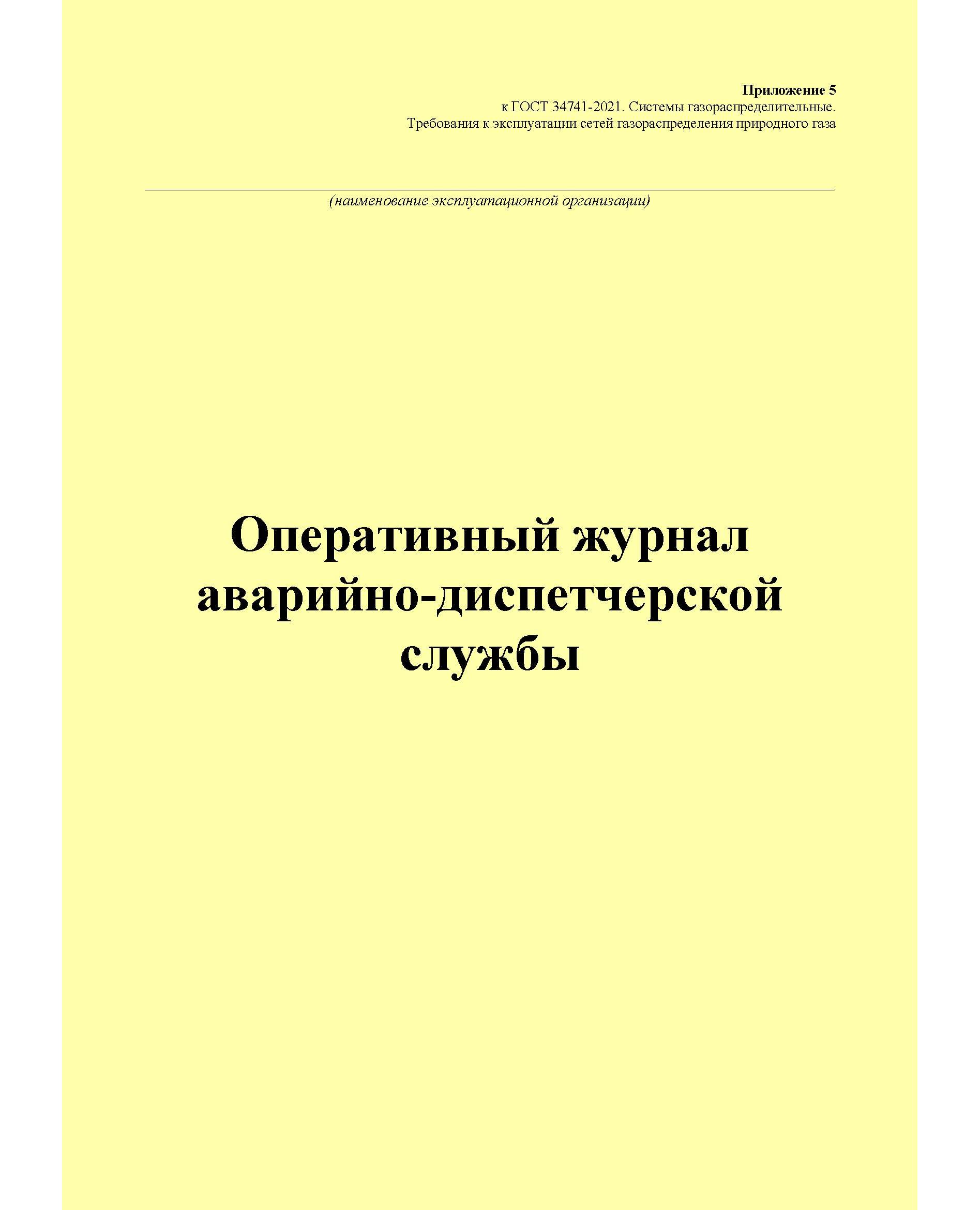 Оперативный журнал аварийно-диспетчерской службы. Приложение 5 к ГОСТ 34741-2021. Системы газораспределительные. Требования к эксплуатации сетей газораспределения природного газа (книжный, прошитый, 100 стр.)