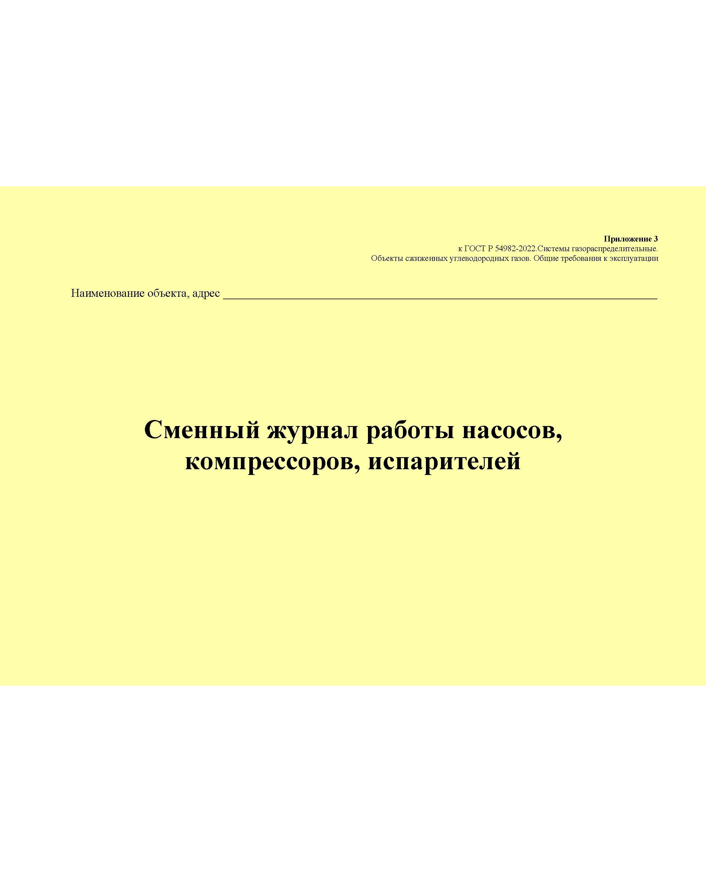 Главная/Журналы (Твердая, мягкая обложка, прошитые)/Объекты газораспределения/Сменный журнал работы насосов, компрессоров, испарителей. Приложение 3 к ГОСТ Р 54982-2022. Системы газораспределительные. Объекты сжиженных углеводородных газов. Общие требования к эксплуатации (альбомный, прошитый, 100 стр.)