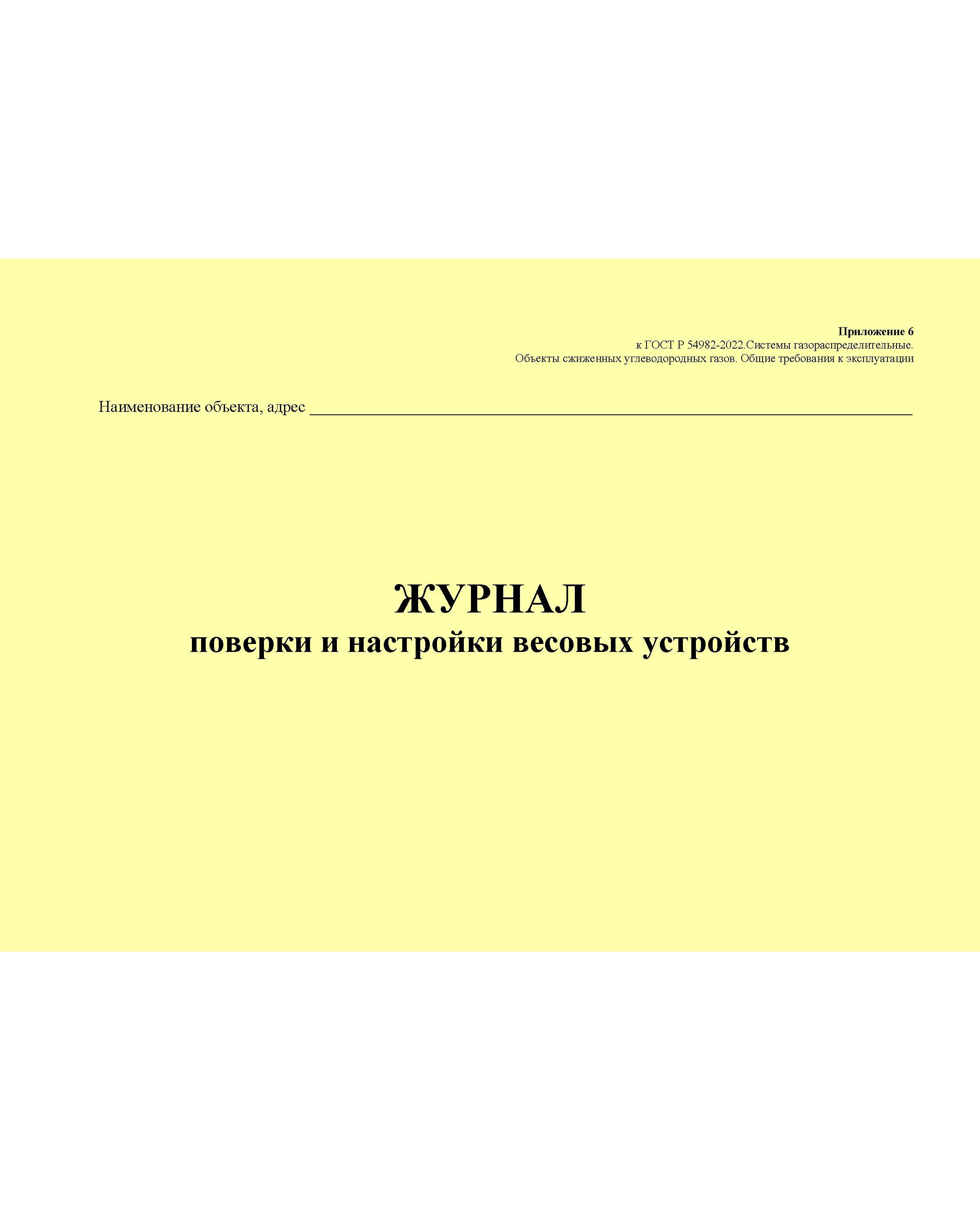 Журнал поверки и настройки весовых устройств. Приложение 6 к ГОСТ Р 54982-2022. Системы газораспределительные. Объекты сжиженных углеводородных газов. Общие требования к эксплуатации (альбомный, прошитый, 100 стр.)