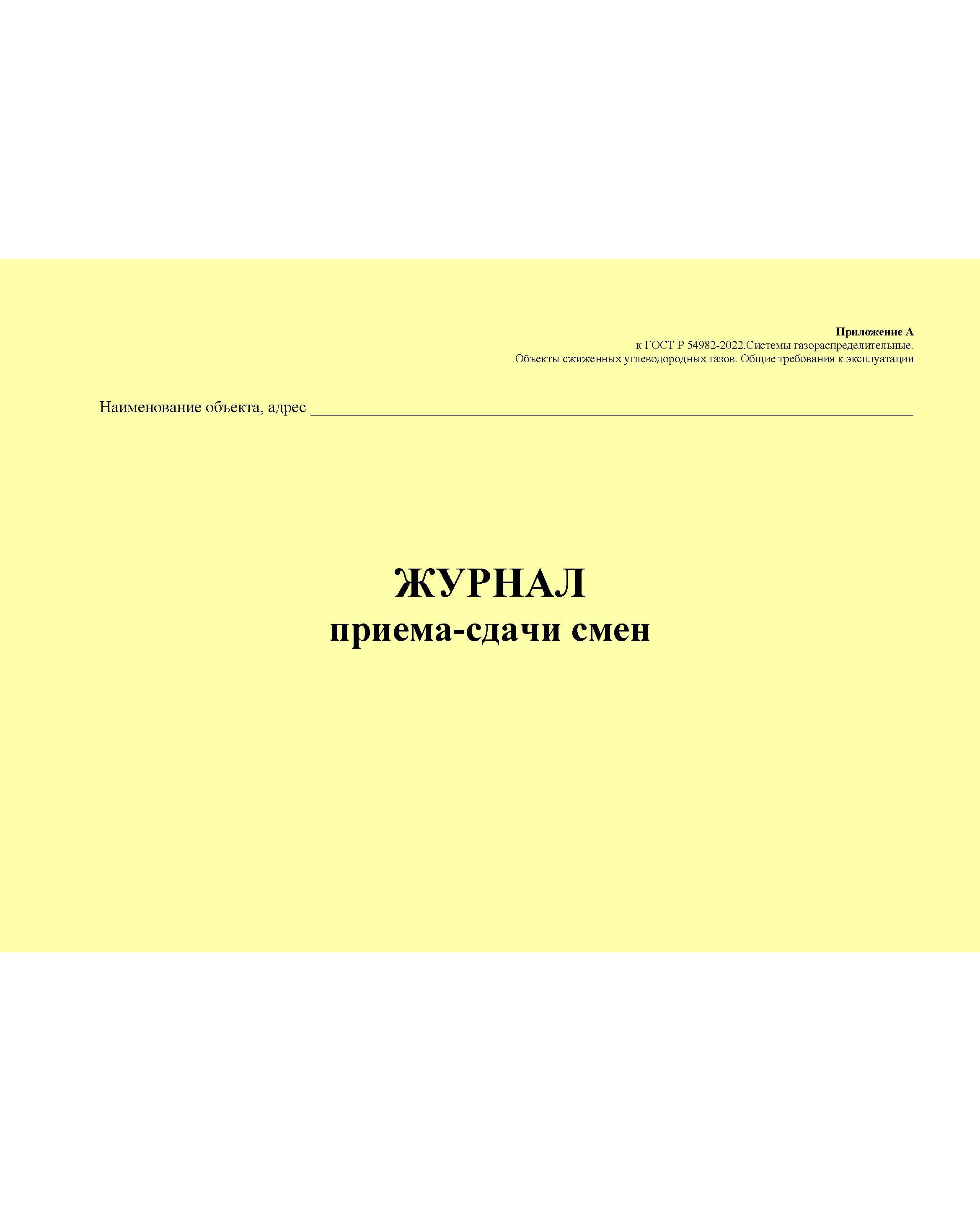 Журнал приема-сдачи смен. Приложение А к ГОСТ Р 54982-2022. Системы газораспределительные. Объекты сжиженных углеводородных газов. Общие требования к эксплуатации (альбомный, прошитый, 100 стр.)