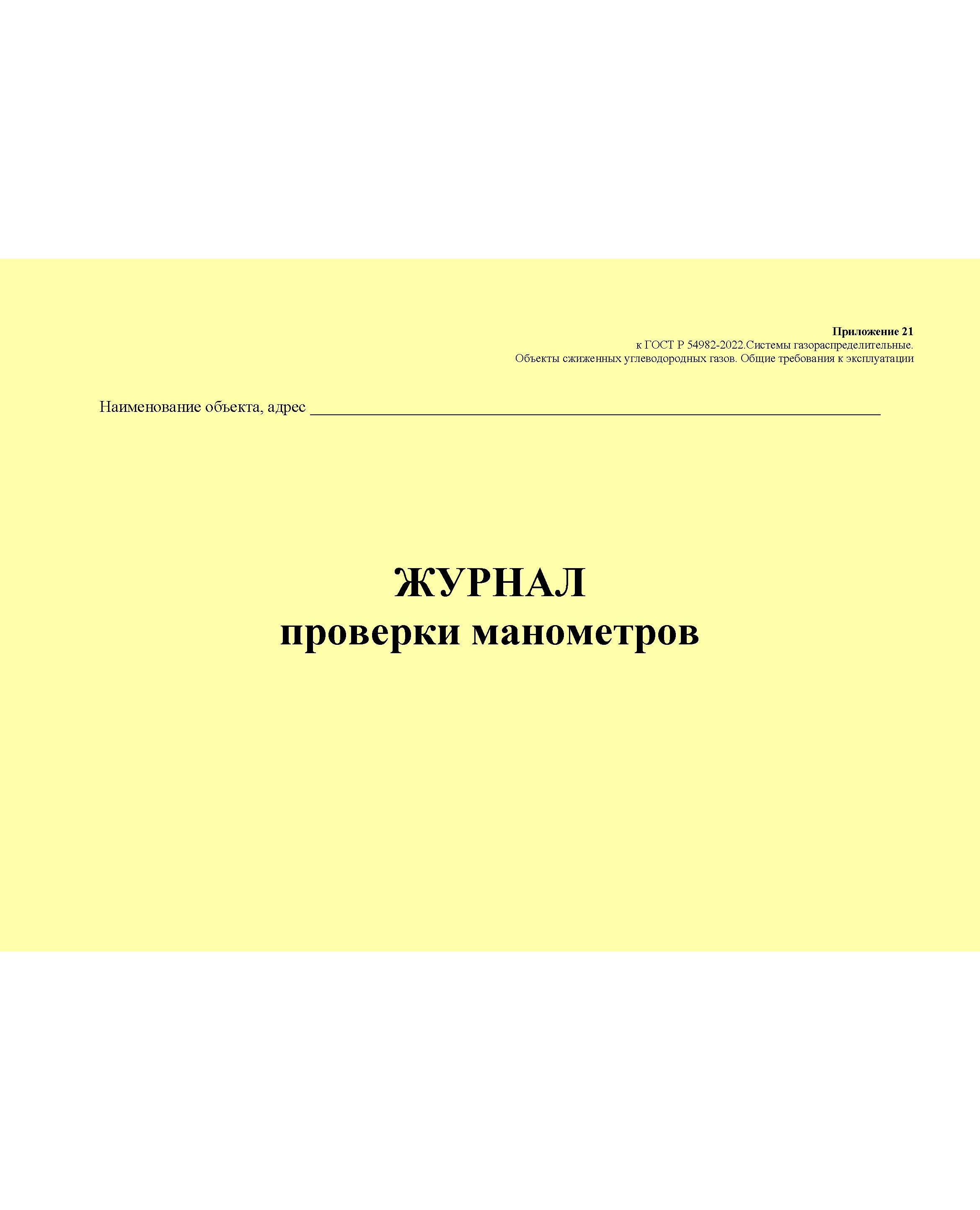 Журнал проверки манометров. Приложение 21 к ГОСТ Р 54982-2022. Системы газораспределительные. Объекты сжиженных углеводородных газов. Общие требования к эксплуатации (альбомный, прошитый, 100 стр.)
