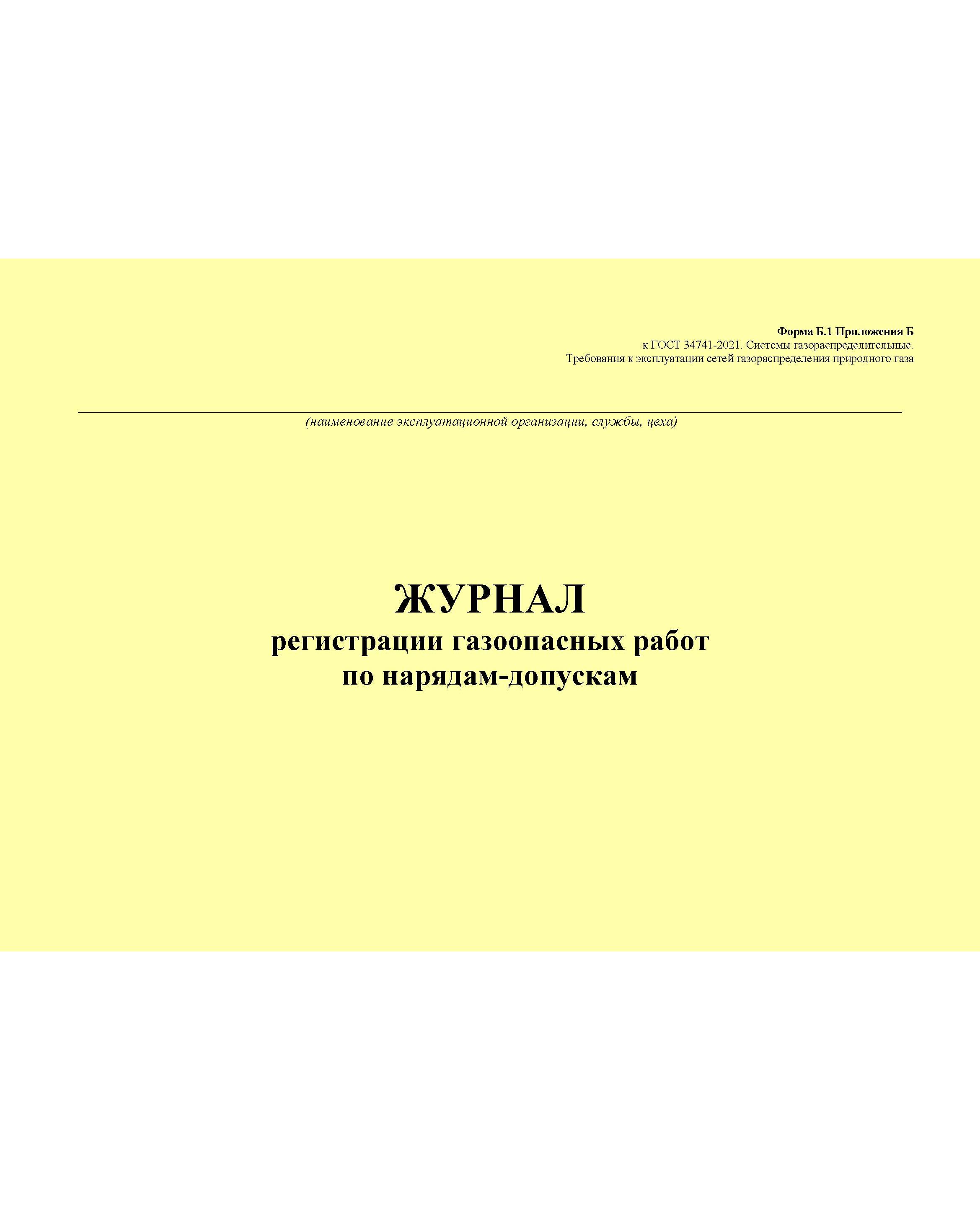 Главная/Журналы (Твердая, мягкая обложка, прошитые)/Объекты газораспределения/Журнал регистрации газоопасных работ по нарядам-допускам. Форма Б.1 Приложения Б к ГОСТ 34741-2021. Системы газораспределительные. Требования к эксплуатации сетей газораспределения природного газа (альбомый, прошитый, 100 стр.)