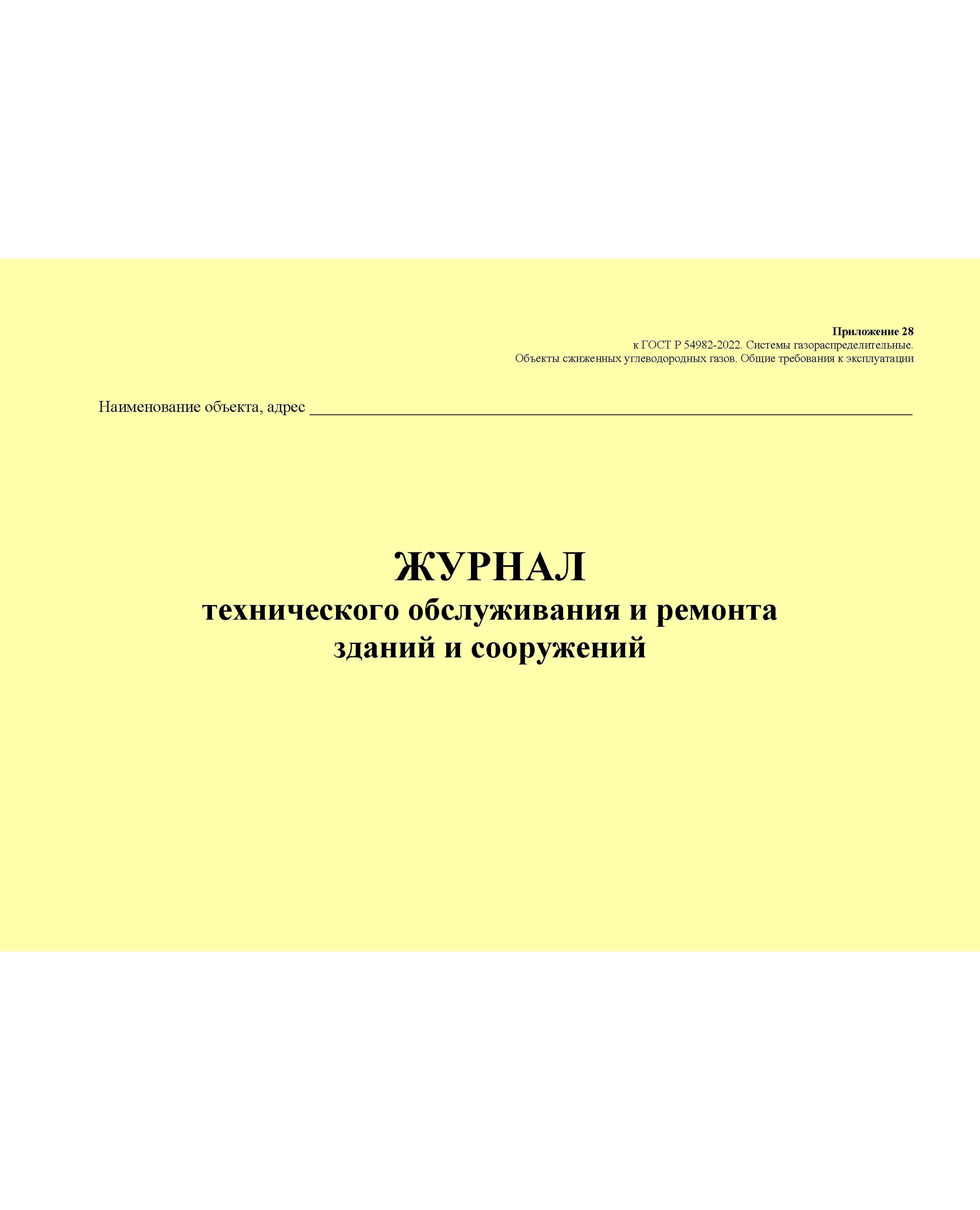 Главная/Журналы (Твердая, мягкая обложка, прошитые)/Объекты газораспределения/Журнал технического обслуживания и ремонта зданий и сооружений. Приложение 28 к ГОСТ Р 54982-2022. Системы газораспределительные. Объекты сжиженных углеводородных газов. Общие требования к эксплуатации (альбомный, прошитый, 100 стр.)