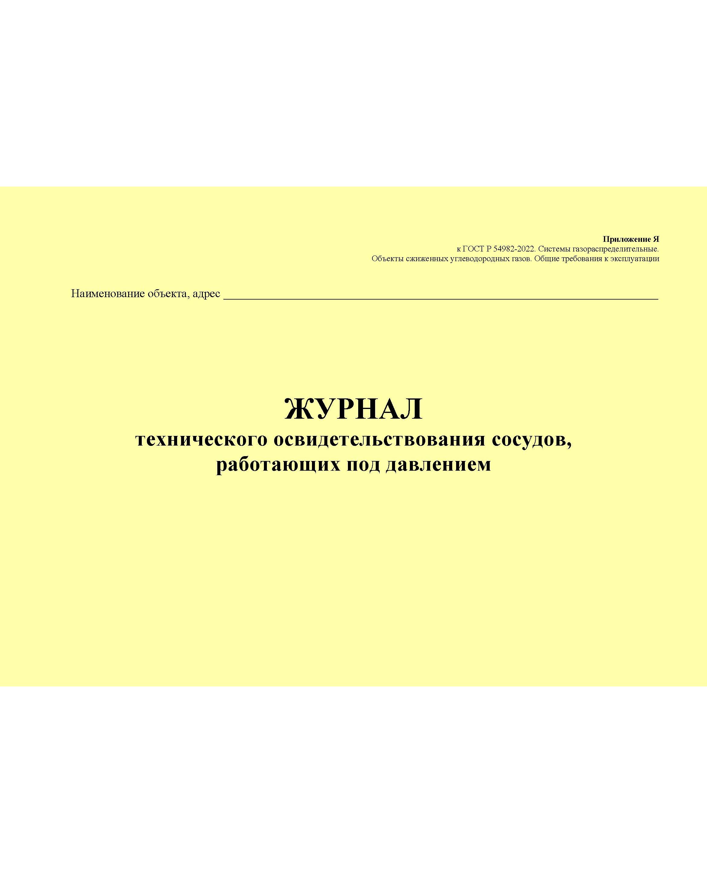 Главная/Журналы (Твердая, мягкая обложка, прошитые)/Объекты газораспределения/Журнал технического освидетельствования сосудов, работающих под давлением. Приложение Я к ГОСТ Р 54982-2022. Системы газораспределительные. Объекты сжиженных углеводородных газов. Общие требования к эксплуатации (альбомный, прошитый, 100 стр.)