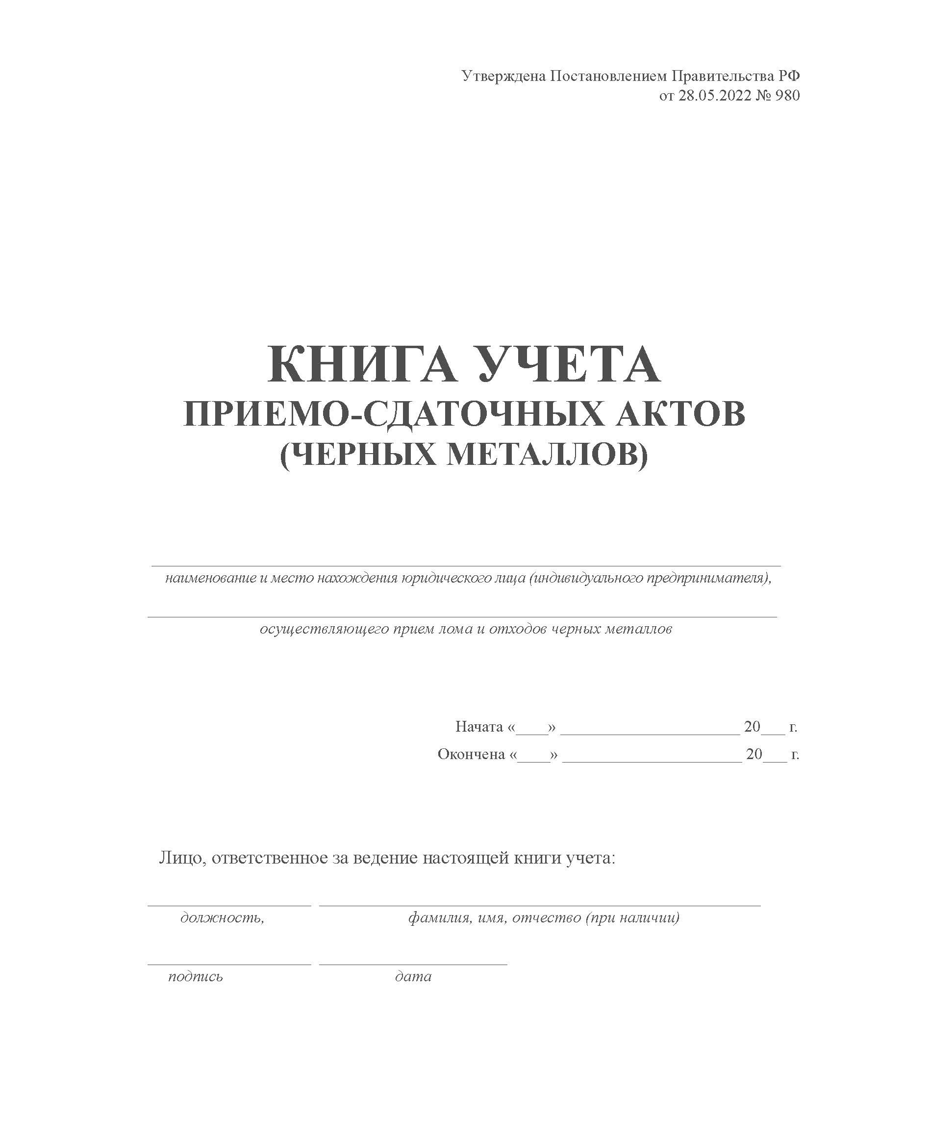 Книга учета приемосдаточных актов (черных металлов). Постановление Правительства РФ от 28.05.2022 № 980 (100 стр., прошитая)