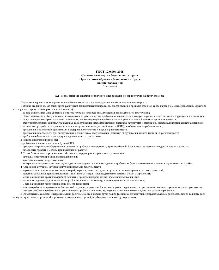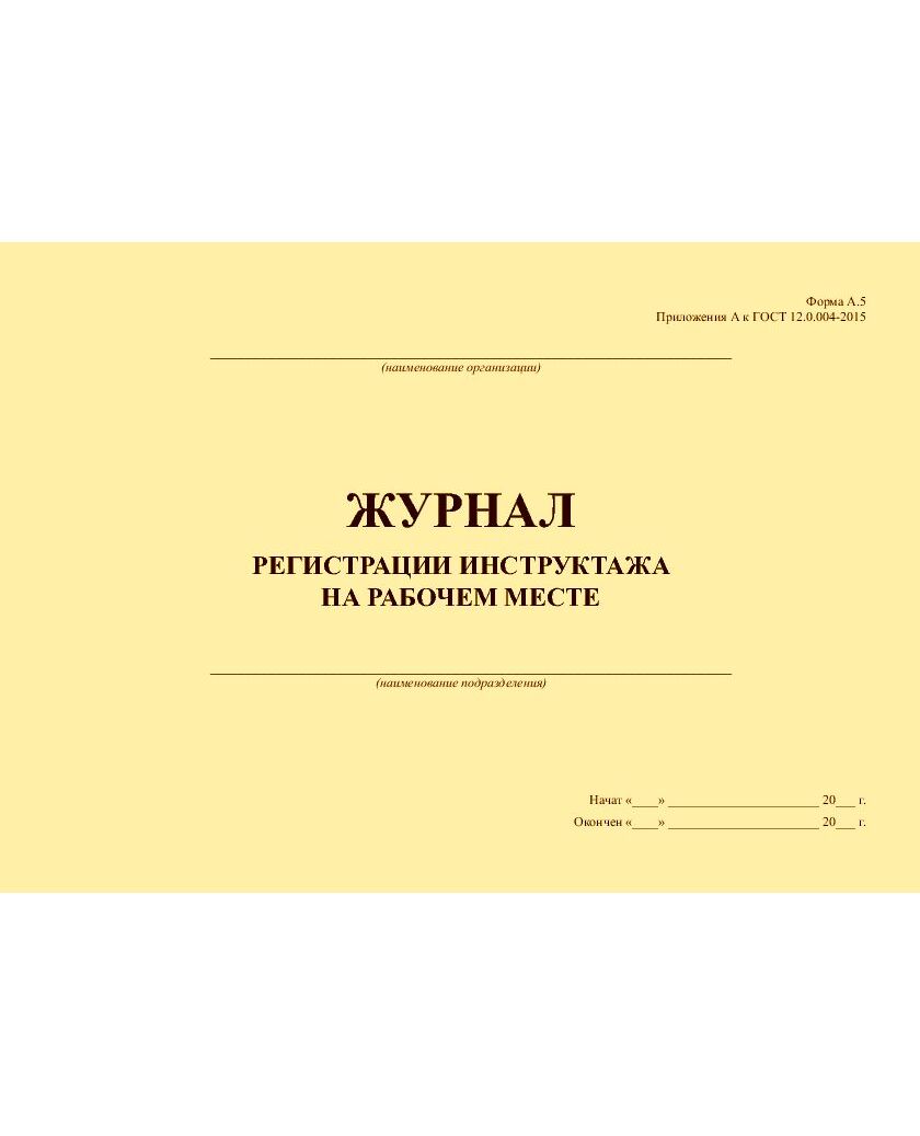 Форма журнала регистрации инструктажа на рабочем месте соответствует Приложению А.5 к ГОСТ 12.0.004-2015 Система стандартов безопасности труда. Организация обучения безопасности труда. Общие положения.