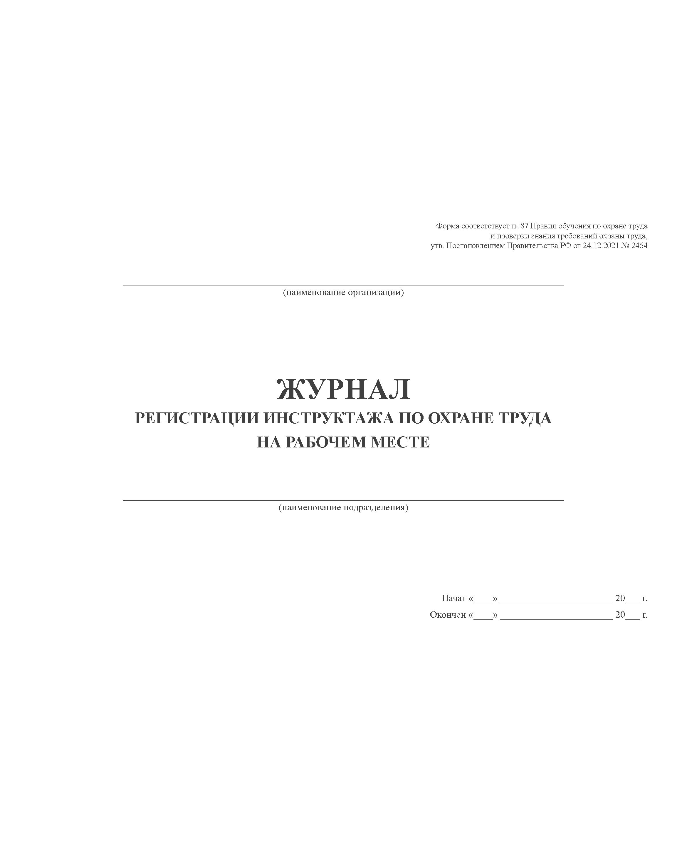 Форма журнала регистрации инструктажа по охране труда на рабочем месте соответствует п. 87 Правил обучения по охране труда и проверки знания требований охраны труда, утв. Постановлением Правительства РФ от 24.12.2021 № 2464. Вступает в силу с 1 сентября 2022 г. и действует до 1 сентября 2026 г.