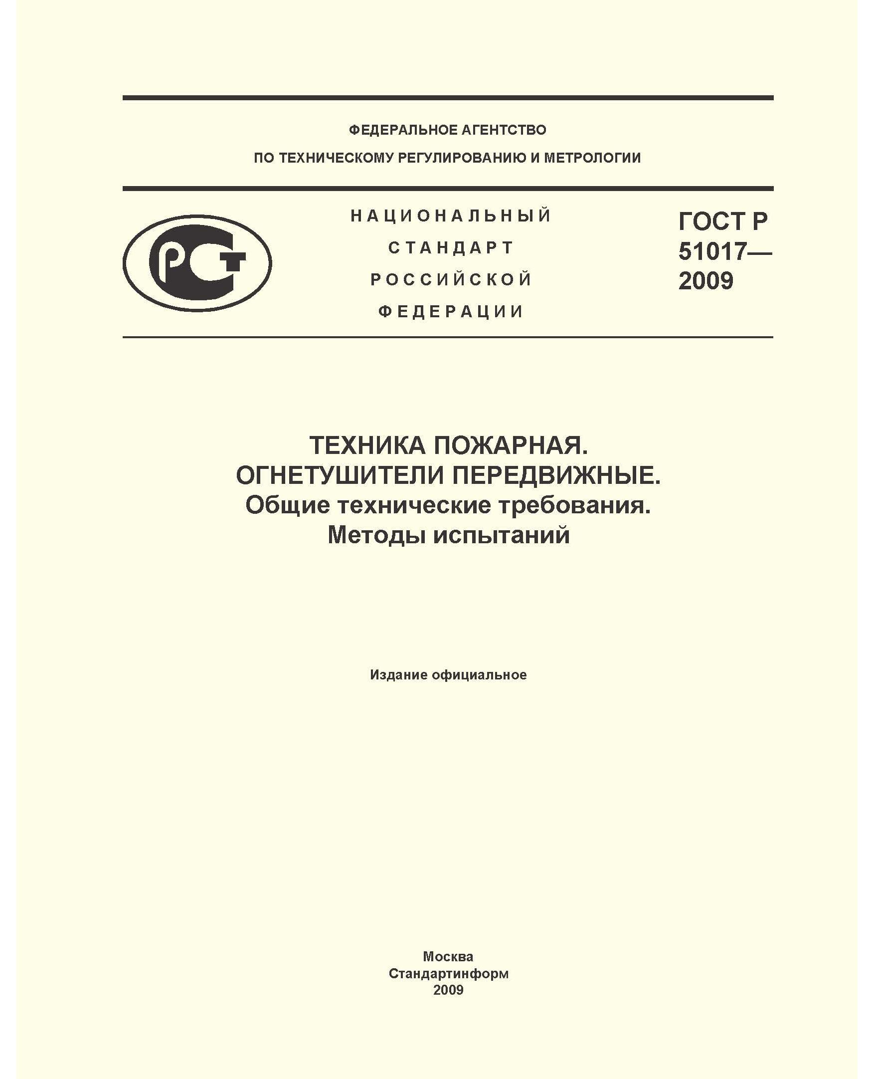 ГОСТ Р 51017-2009. Техника пожарная. Огнетушители передвижные. Общие технические требования. Методы испытаний. Утвержден Постановлением Госстандарта РФ от 25.10.2001 N 435-ст