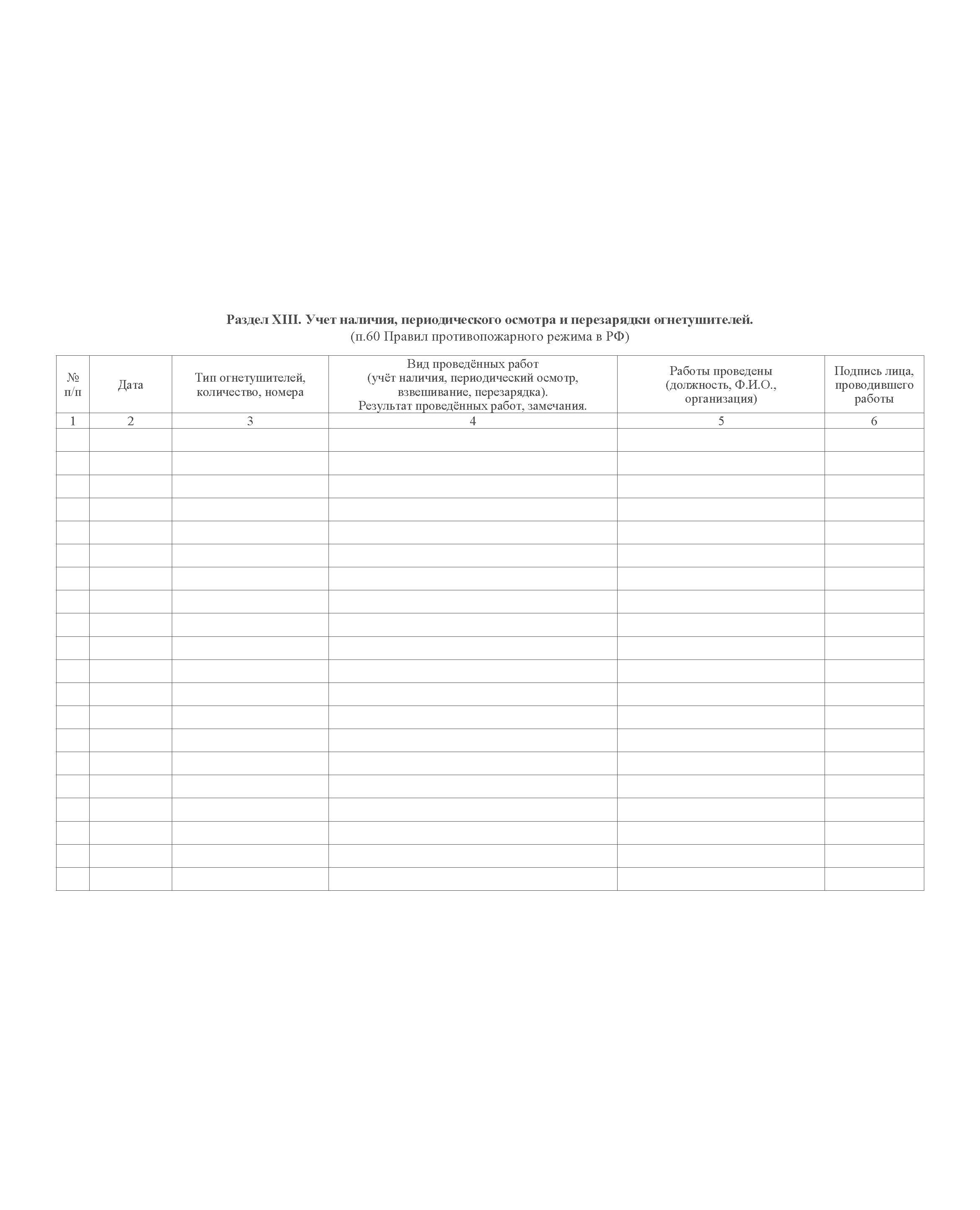 13. Учет наличия, периодического осмотра и перезарядки огнетушителей.