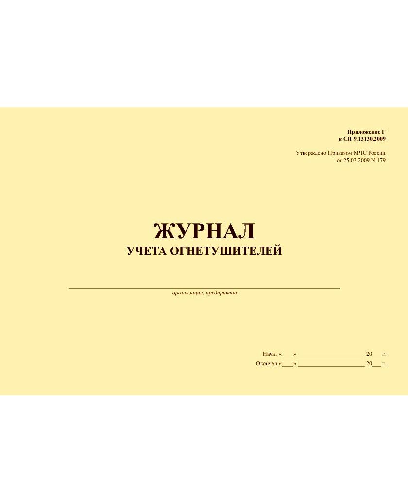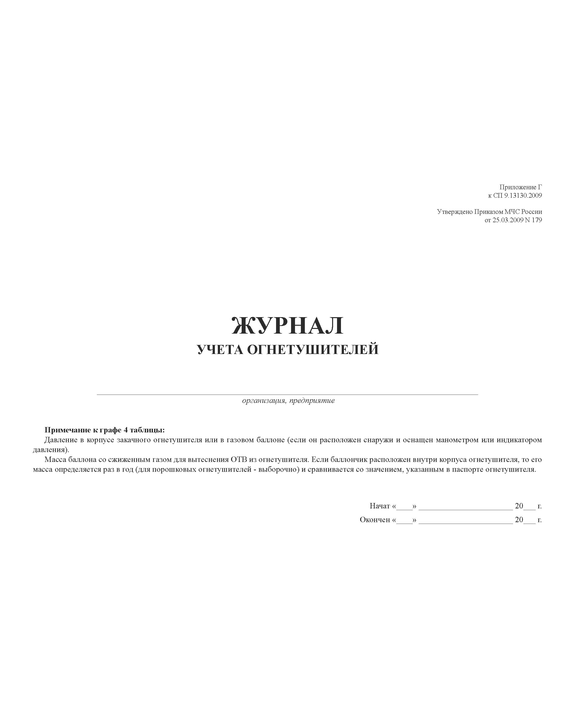 Журнал учета огнетушителей. Приложение Г к СП 9.13130.2009, утв. Приказом МЧС России от 25.03.2009 № 179 (альбомный, прошитый, 100 страниц)