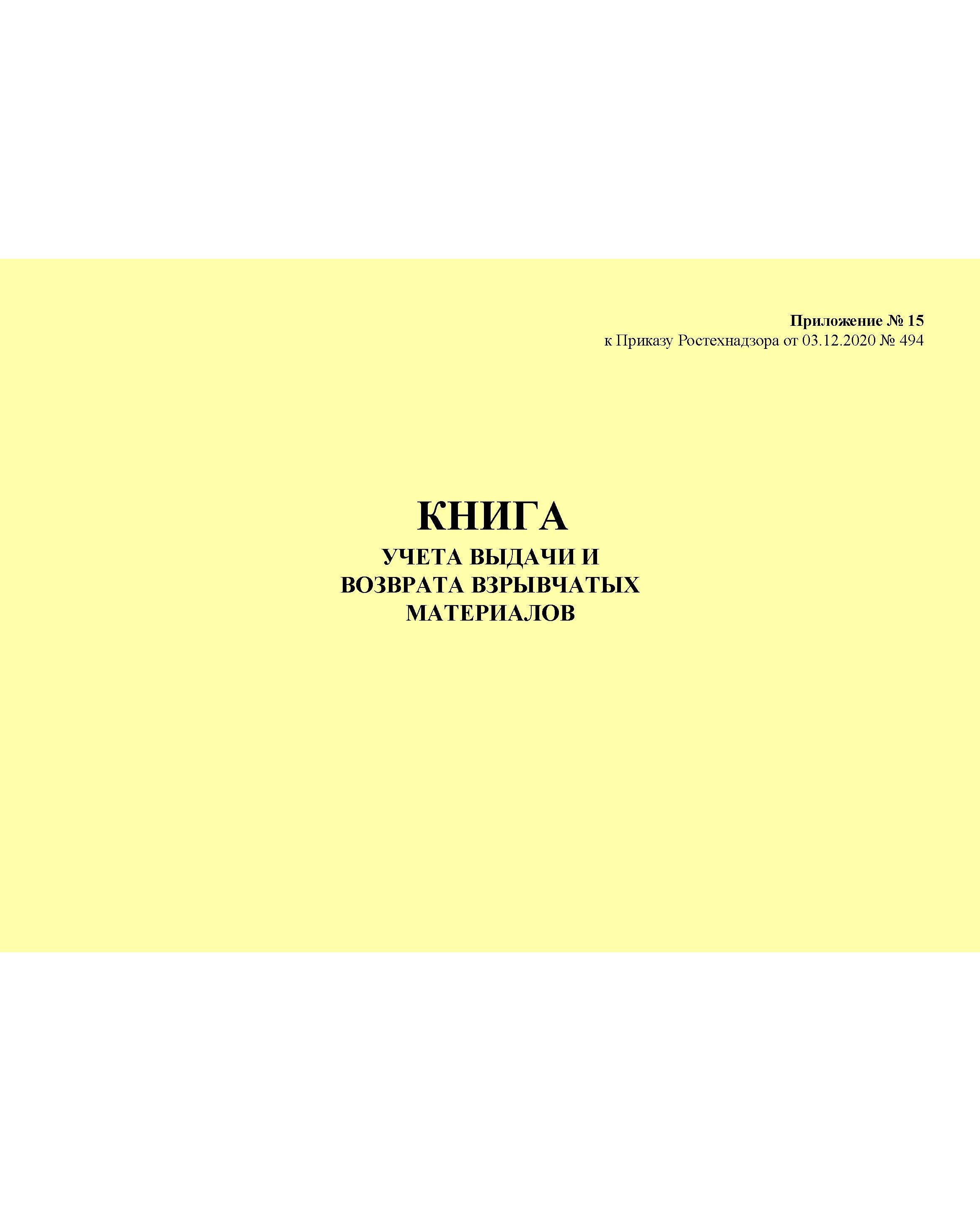 Книга учета выдачи и возврата взрывчатых материалов. Приложение № 15 к ФНиП "Правила безопасности при производстве, хранении и применении взрывчатых материалов промышленного назначения", утв. Приказом Ростехнадзора от 03.12.2020 № 494 (ред. от 25.05.2022) (альбомный, прошитый, 100 стр.)