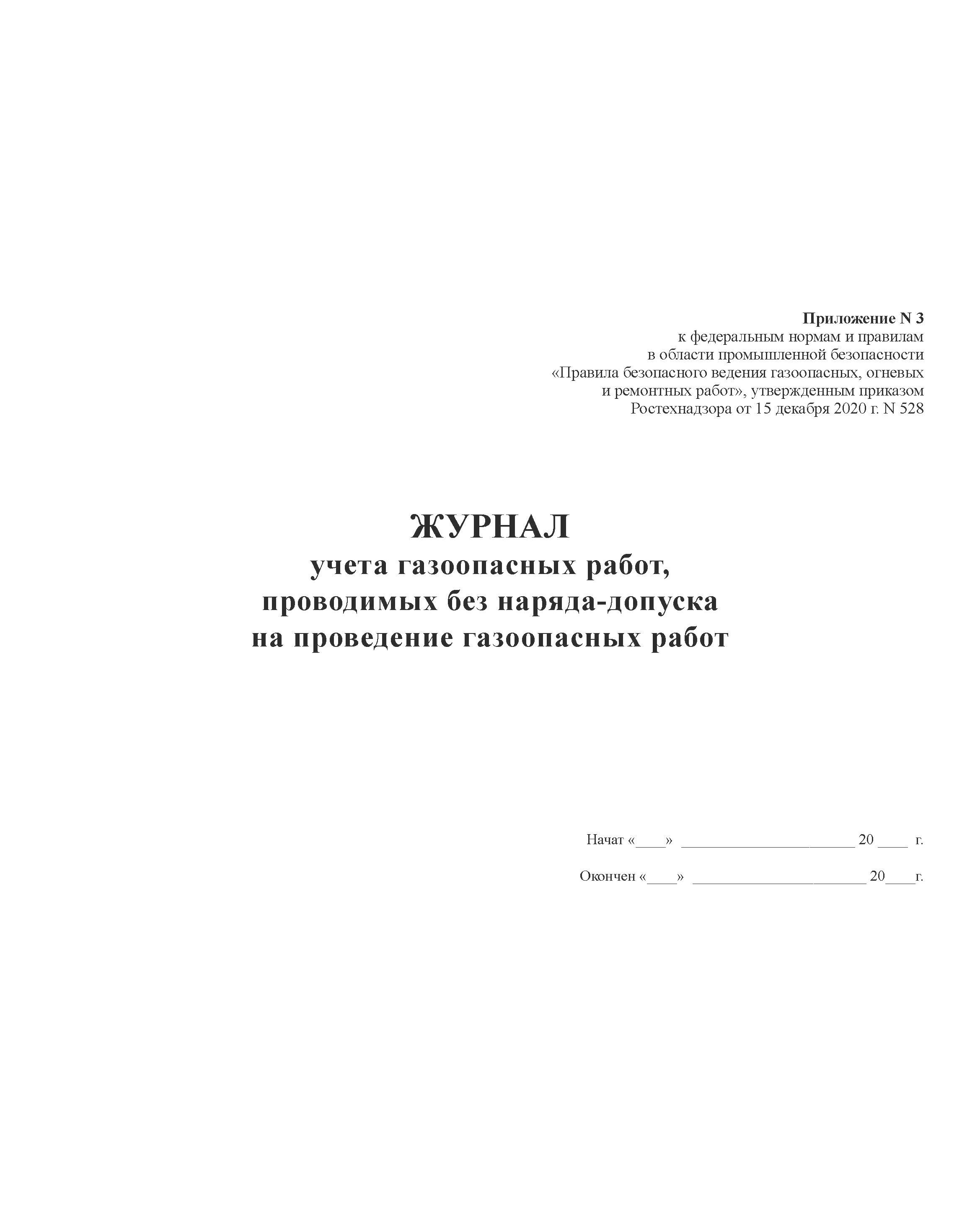 Главная/Журналы (Твердая, мягкая обложка, прошитые)/Промышленная безопасность/Журнал учета газоопасных работ, проводимых без наряда-допуска на проведение газоопасных работ. Приложение № 3 к ФНиП "Правила безопасного ведения газоопасных, огневых и ремонтных работ", утв. Приказом Ростехнадзора от 15.12.2020 № 528 (100 стр., прошитый)