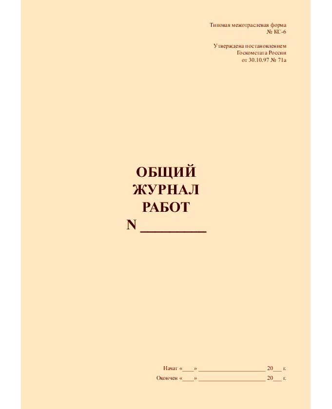 Общий журнал работ по форме КС-6 применяется для учета выполнения строительно-монтажных работ. Является основным первичным документом, отражающим технологическую последовательность, сроки, качество выполнения и условия производства строительно-монтажных работ. Код по форме ОКУД 0336001.