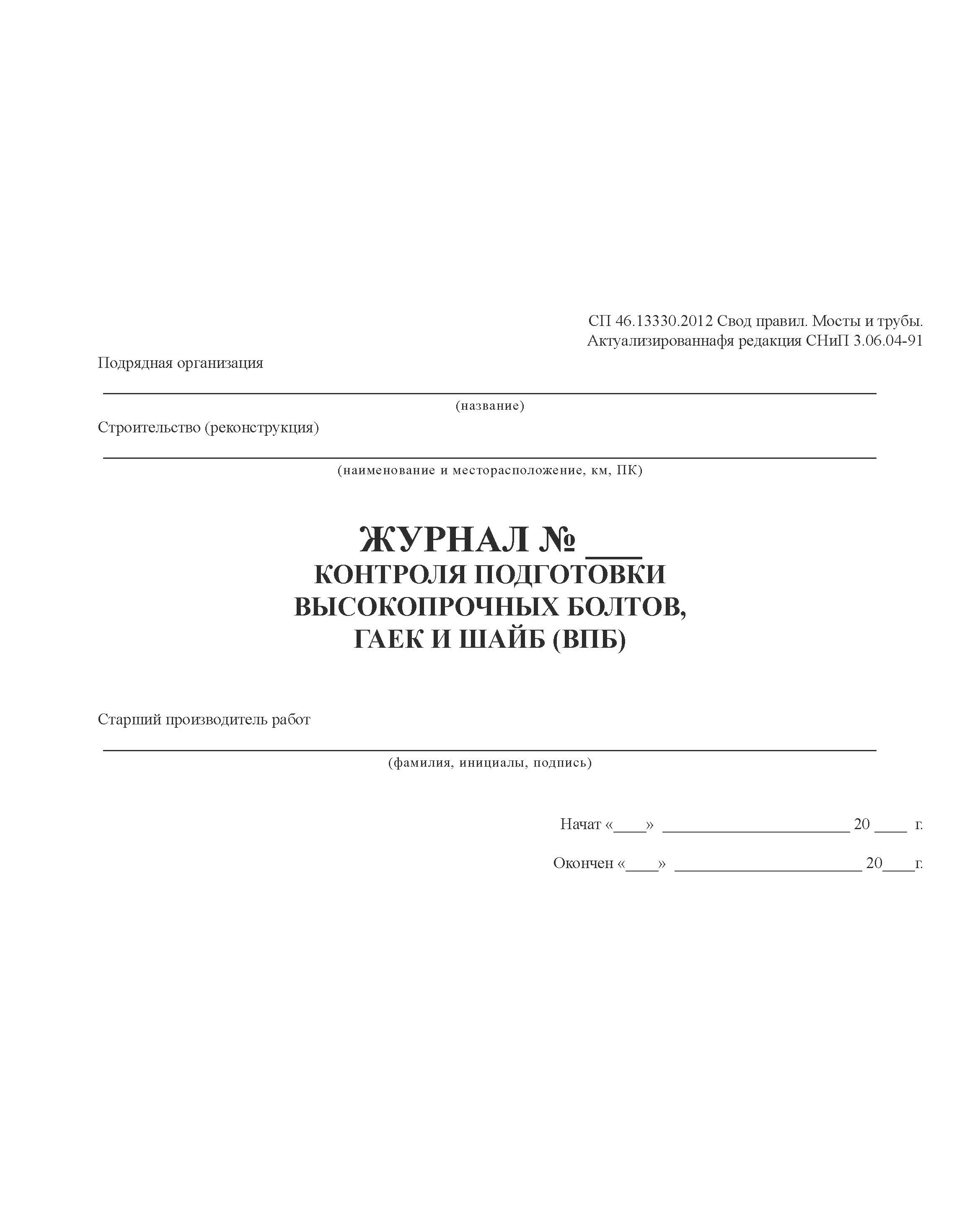 Журнал контроля подготовки высокопрочных болтов, гаек и шайб (ВПБ) (100 стр., прошитый)