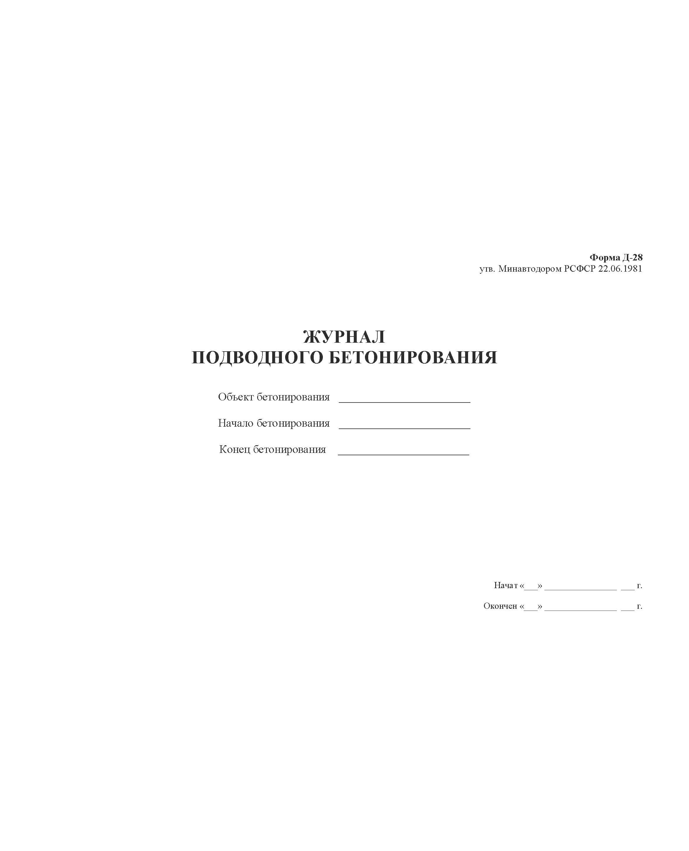 Главная/Журналы (Твердая, мягкая обложка, прошитые)/Строительство/Журнал подводного бетонирования. Форма Д-28 к ВСН 19-81. Правила приемки работ при строительстве, капитальном и среднем ремонте автомобильных дорог" (утв. Минавтодором РСФСР 22.06.1981) (прошитый, 100 страниц)