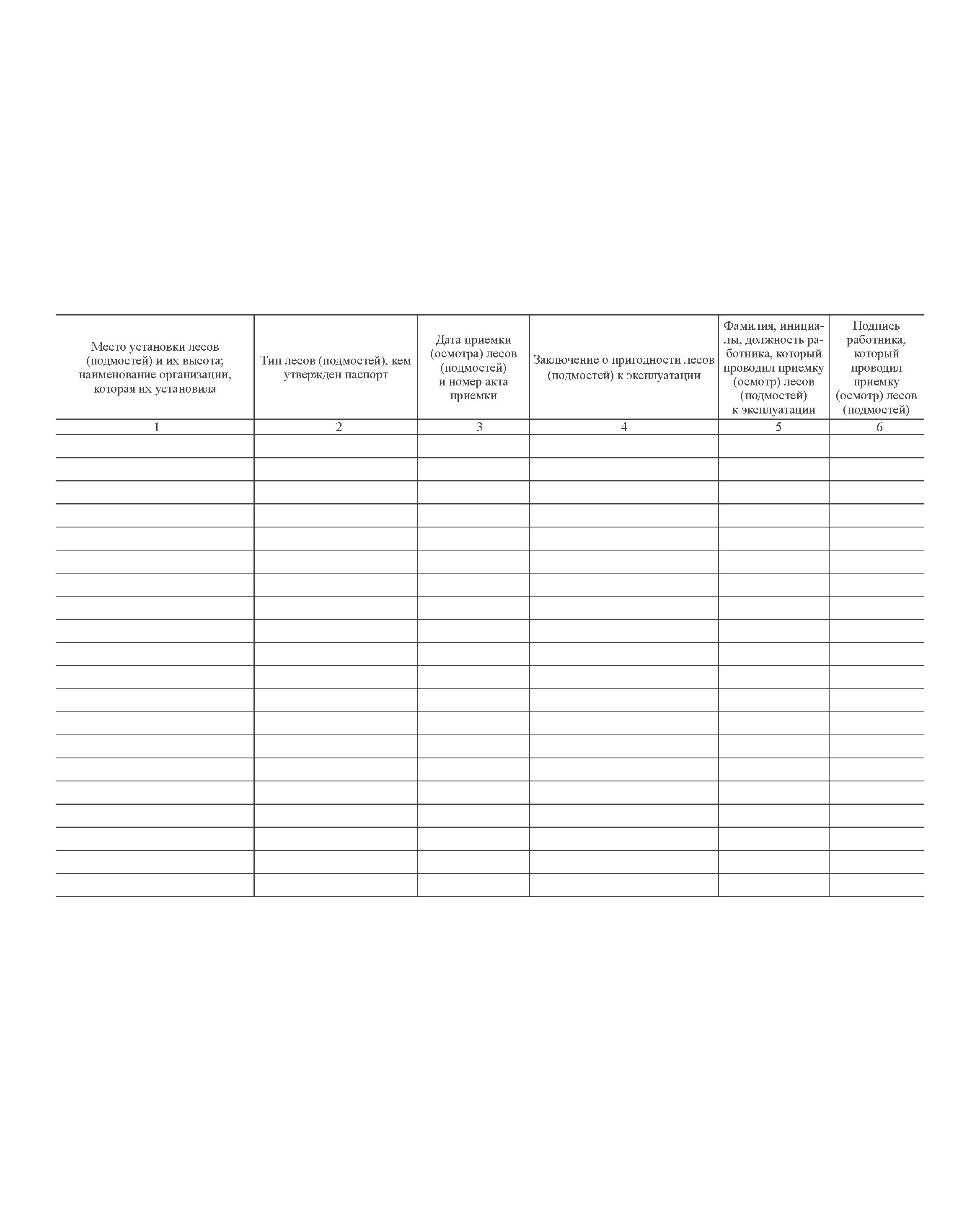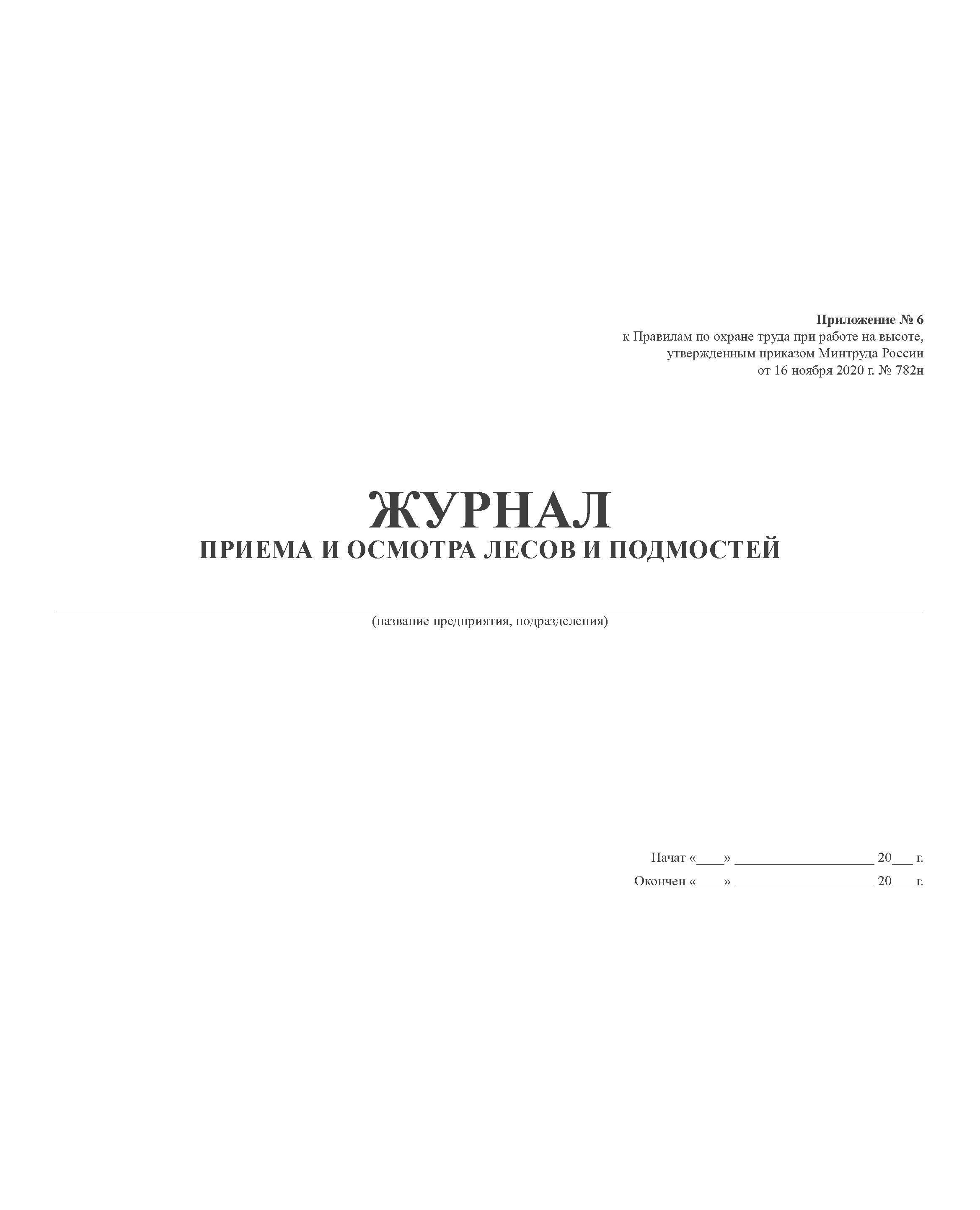 Журнал приема и осмотра лесов и подмостей, Прил. № 6 к Правилам по охране труда при работе на высоте, утв. Приказом Минтруда от 16.11.2020 № 782н (прошитый, 100 страниц)