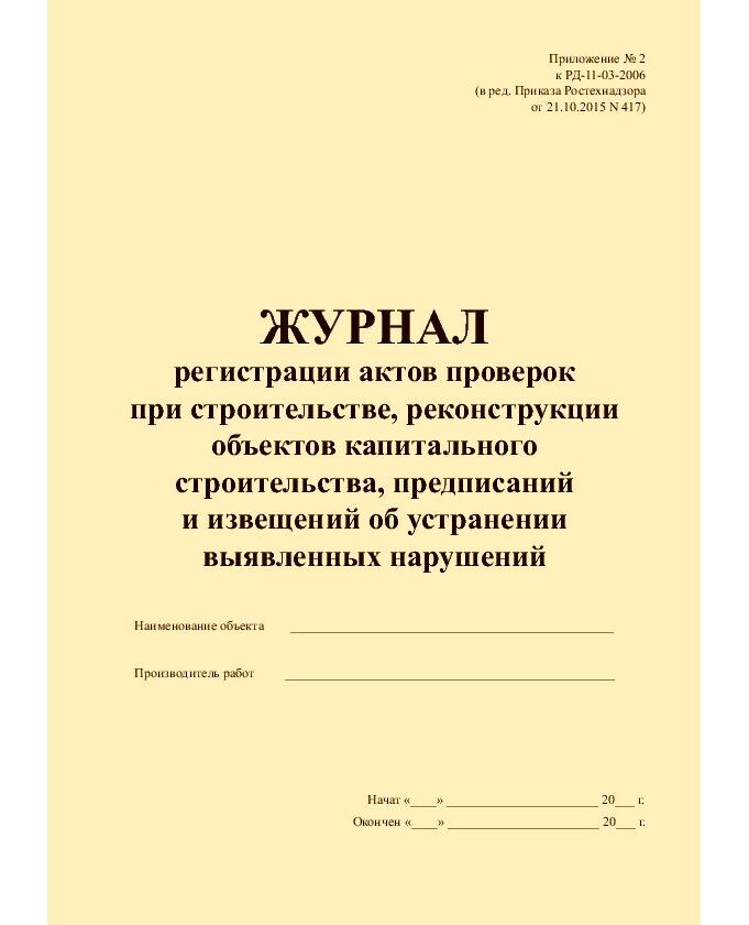 Главная/Журналы (Твердая, мягкая обложка, прошитые)/Строительство/Журнал регистрации актов проверок при строительстве, реконструкции объектов капитального строительства, предписаний и извещений об устранении выявленных нарушений. Приложение № 2 к РД-11-03-2006 (в ред. от 21.10.2015 № 417) (прошитый, 100 страниц)