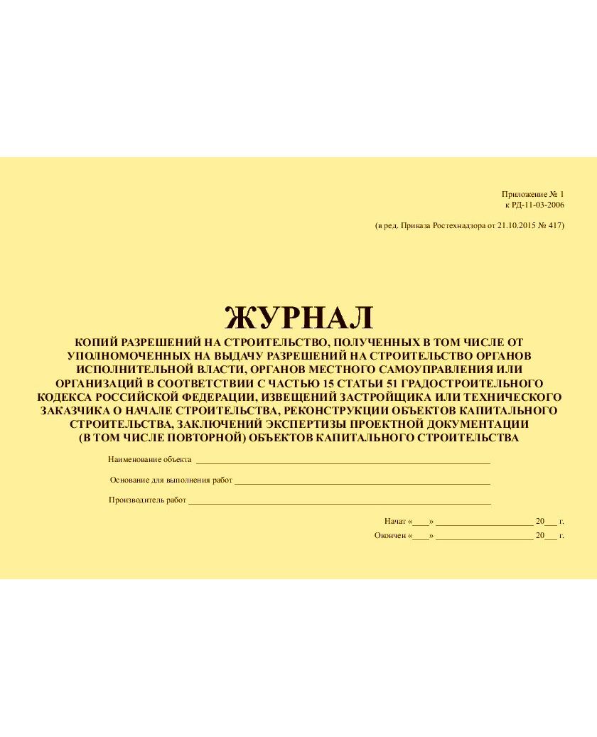 Главная/Журналы (Твердая, мягкая обложка, прошитые)/Строительство/Журнал регистрации копий разрешений на строительство, извещений застройщика или заказчика о начале строительства, реконструкции, капитального ремонта объектов капитального строительства, проектной документации объектов капитального строительства, общего и специального журналов, в которых ведется учет выполнения работ по строительству, реконструкции, капитальному ремонту объектов капитального строительства. Приложение № 1 к РД-11-03-2006 в ред. Приказа Ростехнадзора от 21.10.2015 № 417 (прошитый, 100 страниц)