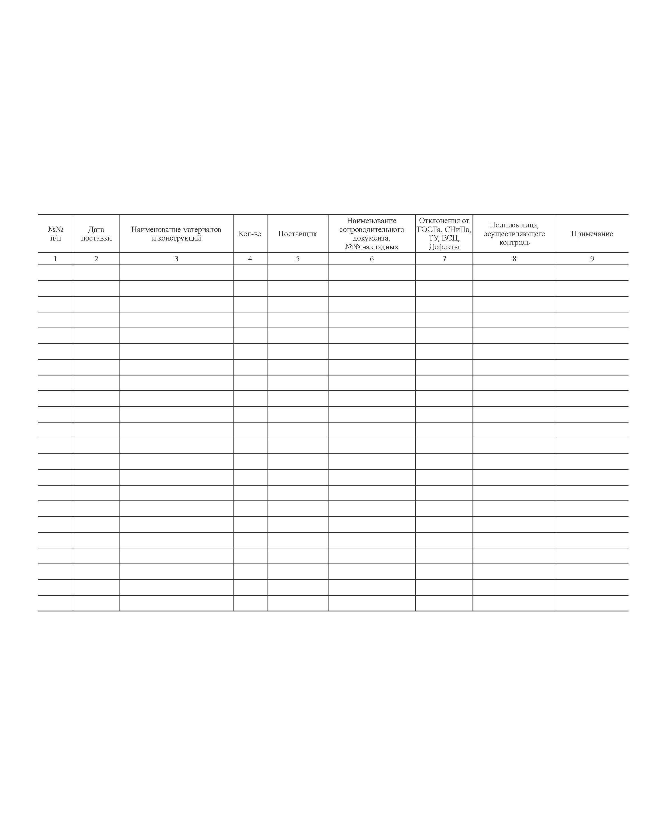 4. В журнале указывается наименование и количество поступивших на объект основных строительных материалов, изделий и конструкций, номер товарно-транспортных накладных, поставщиков, сведения о дефектах.
