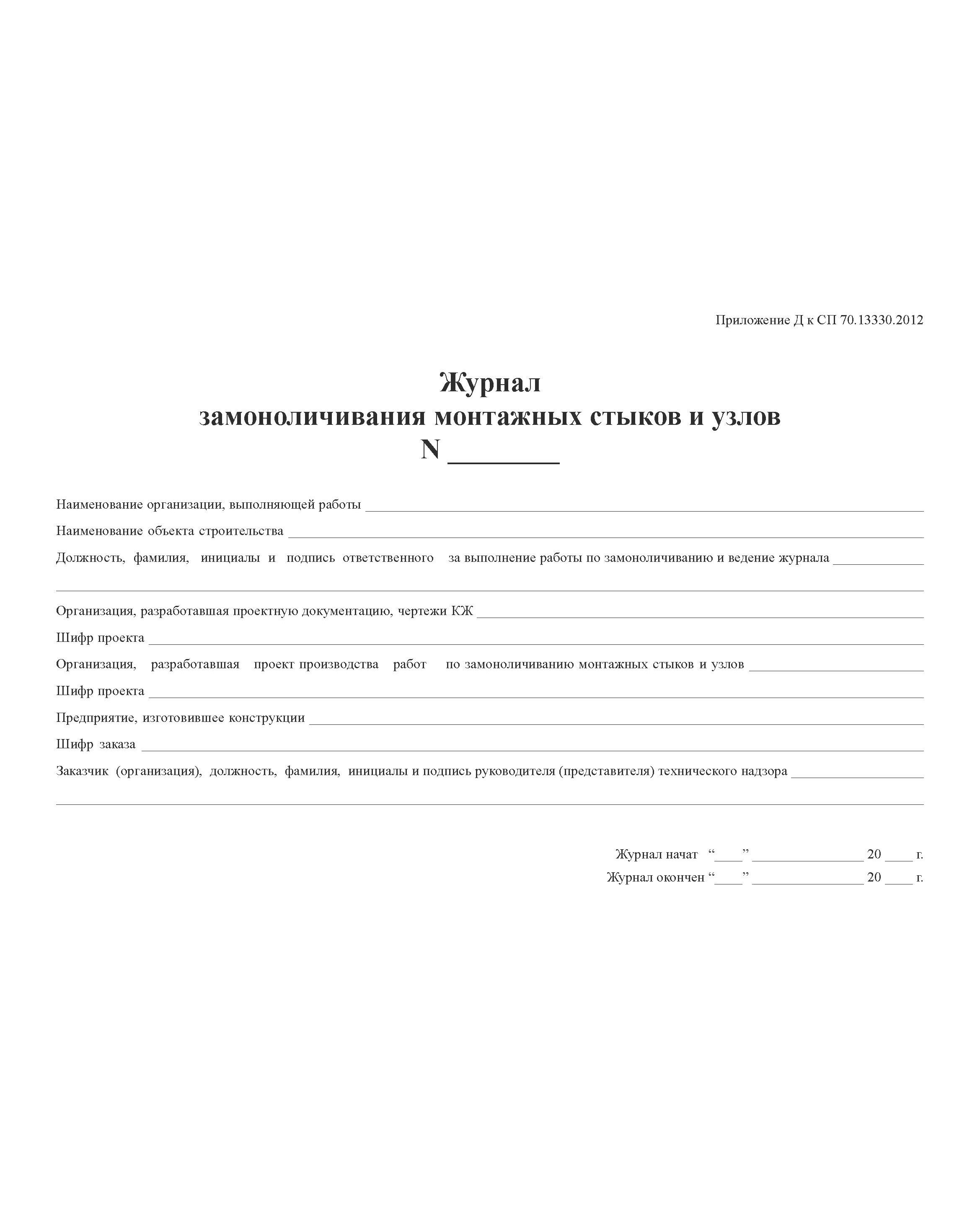 Главная/Журналы (Твердая, мягкая обложка, прошитые)/Строительство/Журнал замоноличивания монтажных стыков и узлов. Приложение Г к СП 70.13330.2012 (в ред. Изменения N 4, утв. Приказом Минстроя России от 30.12.2020 N 905/пр) (альбомный, прошитый, 100 страниц)