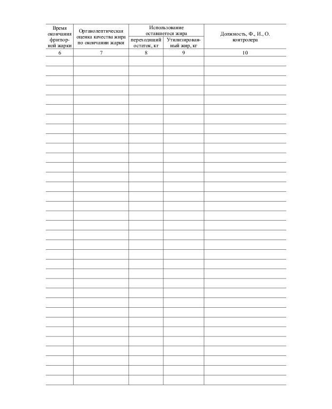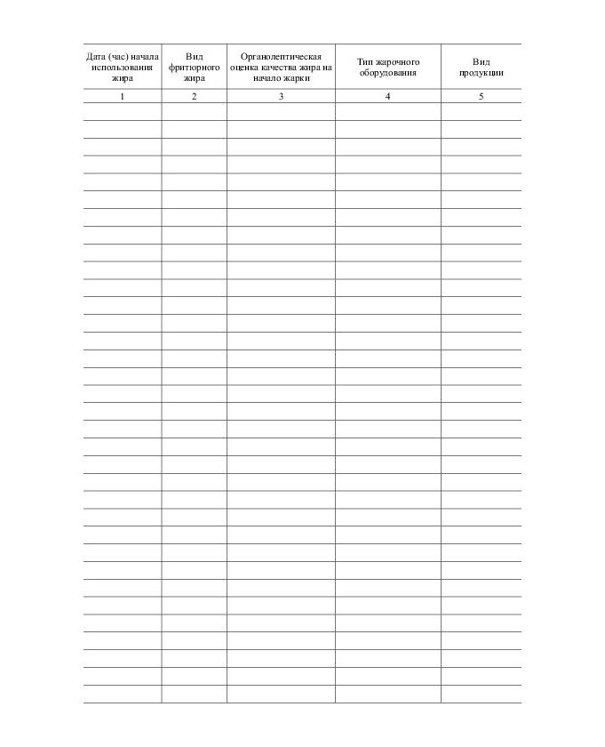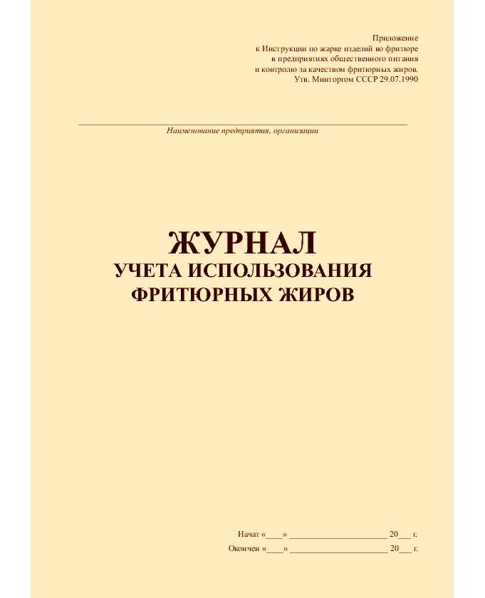 Журнал учета использования фритюрных жиров основан на Приложения к Инструкции по жарке изделий во фритюре в предприятиях общественного питания и контролю за качеством фритюрных жиров. Утв. Минторгом СССР 29.07.1990.