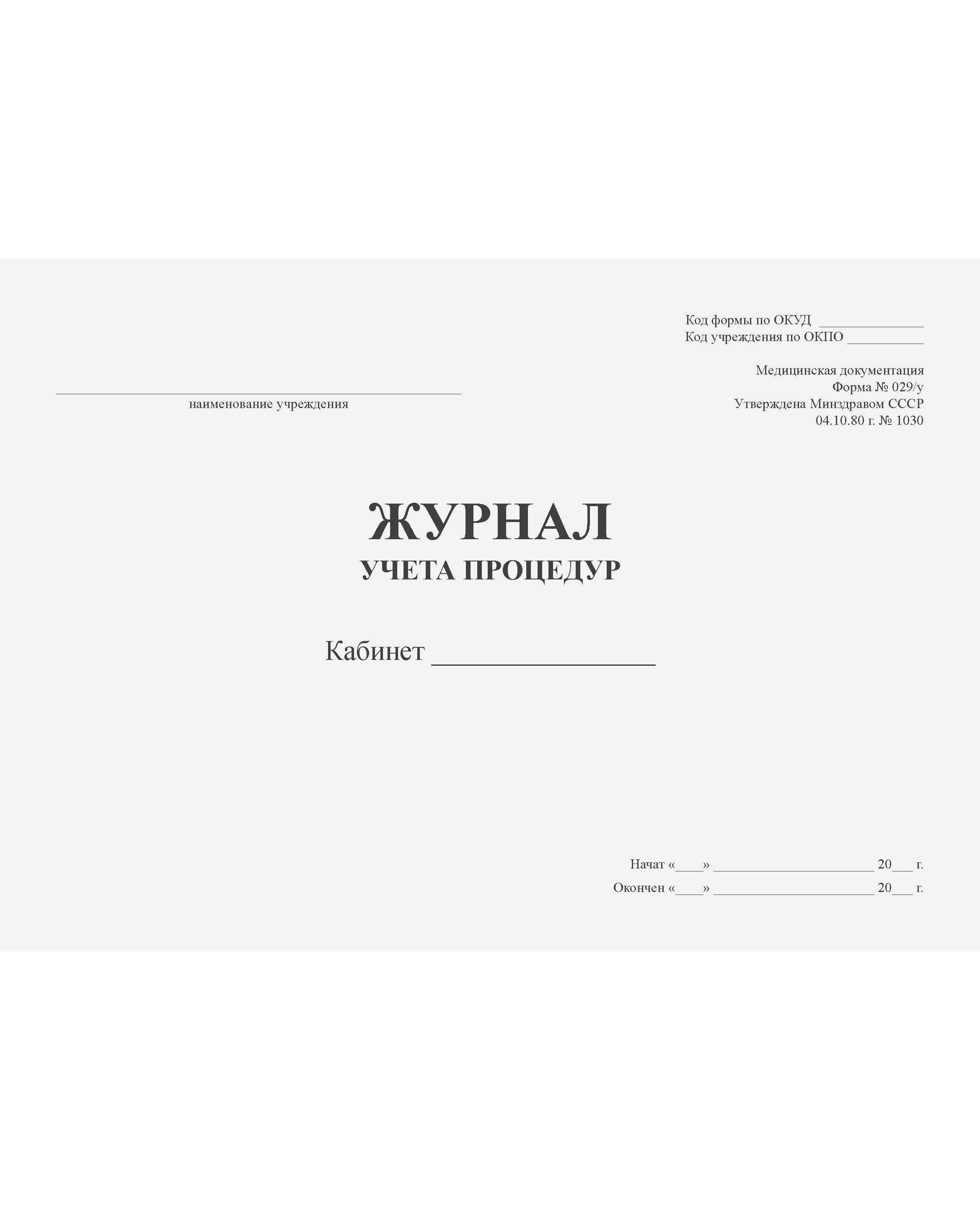 Журнал учета процедур. Форма № 029/у. Утверждена Минздравом СССР 04.10.80 г. № 1030 (прошитый, 96 страниц)