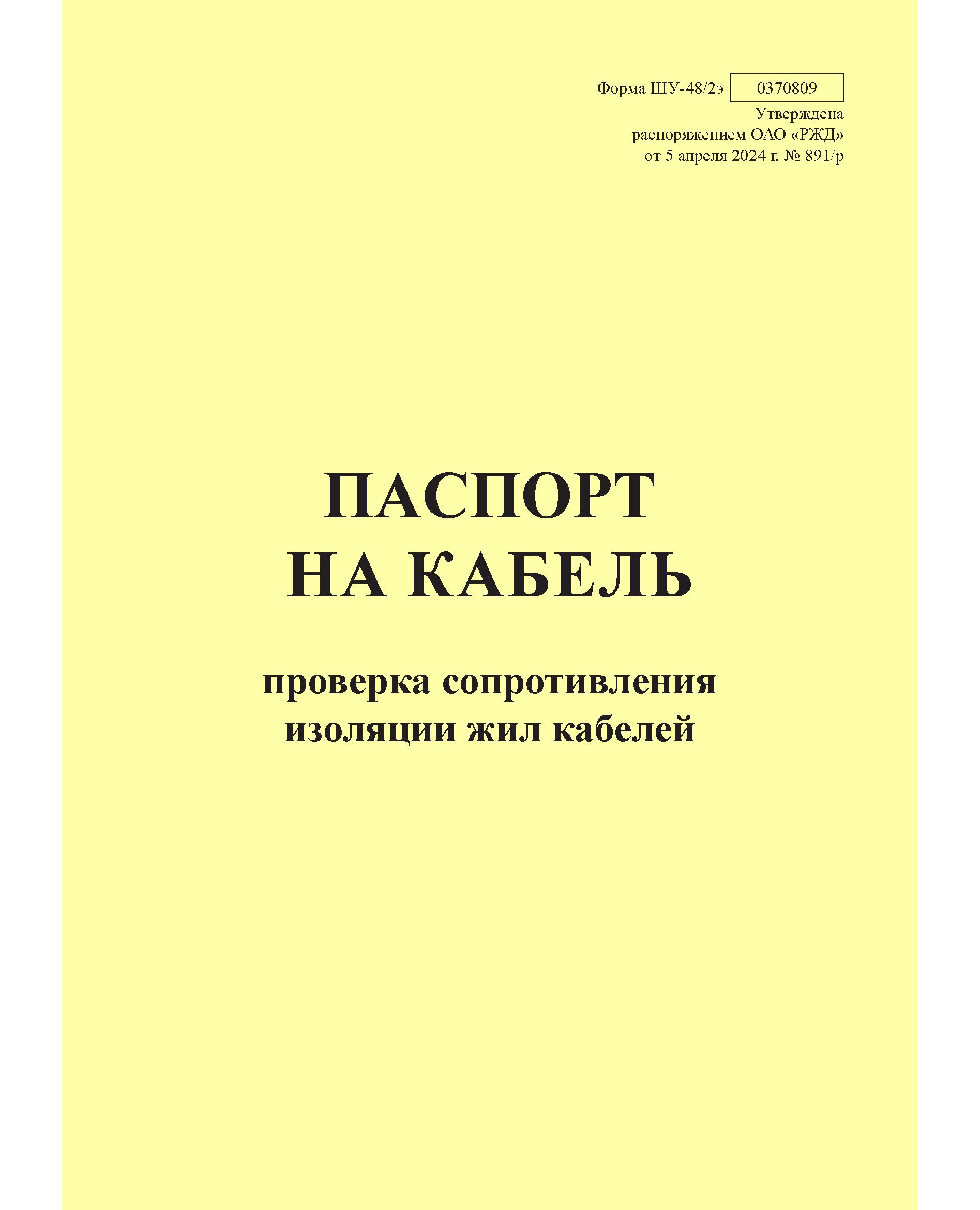 Форма ШУ-48/2э. Паспорт на кабель. Проверка сопротивления изоляции жил кабелей. утв. Распоряжением ОАО "РЖД" от 05.04.2024 № 891/р (книжный, прошитый, 100 страниц)