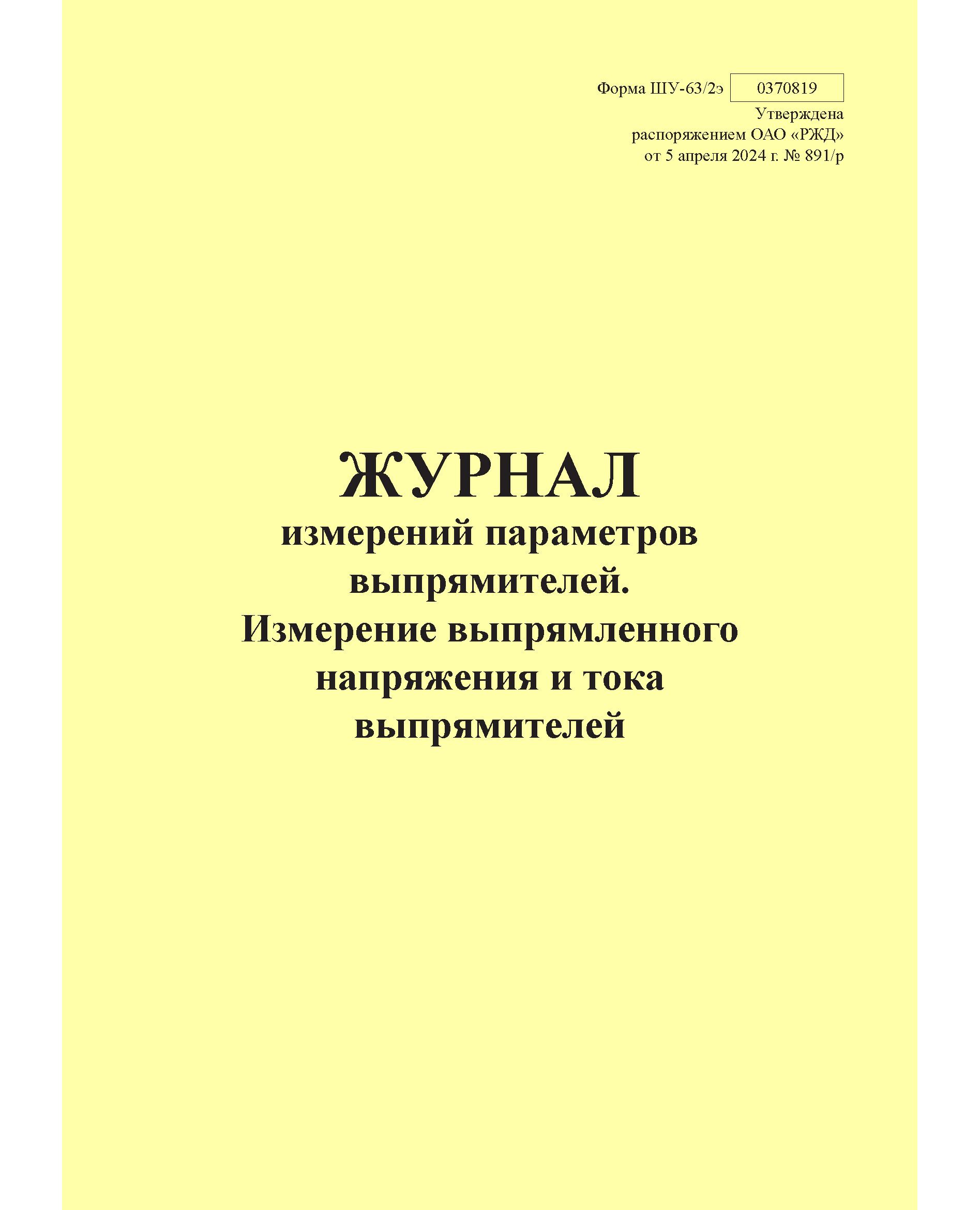 Форма ШУ-63/2э. Журнал измерений параметров выпрямителей. Измерение выпрямленного напряжения и тока выпрямителей, утв. Распоряжением ОАО "РЖД" от 05.04.2024 № 891/р (книжный, прошитый, 100 страниц)