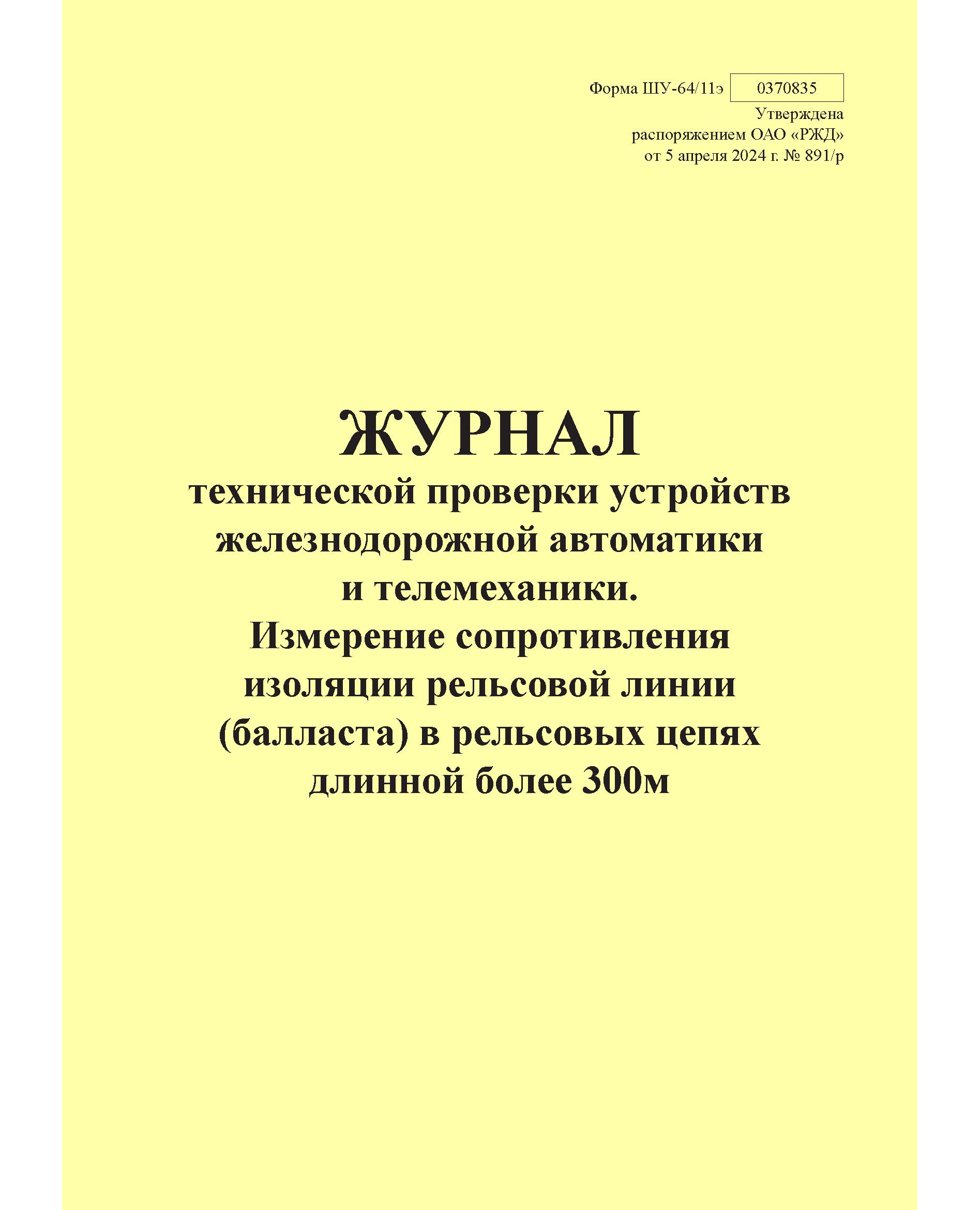 Форма ШУ-64/11э. Журнал технической проверки устройств железнодорожной автоматики и телемеханики. Измерение сопротивления изоляции рельсовой линии (балласта) в рельсовых цепях длинной более 300м, утв. Распоряжением ОАО "РЖД" от 05.04.2024 № 891/р (книжный, прошитый, 100 страниц)